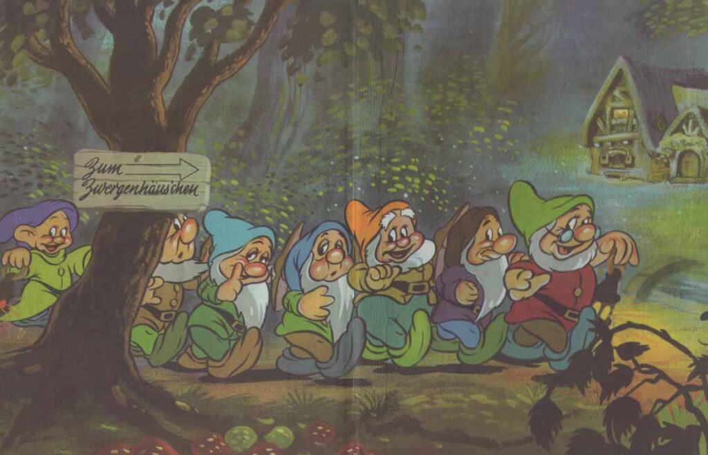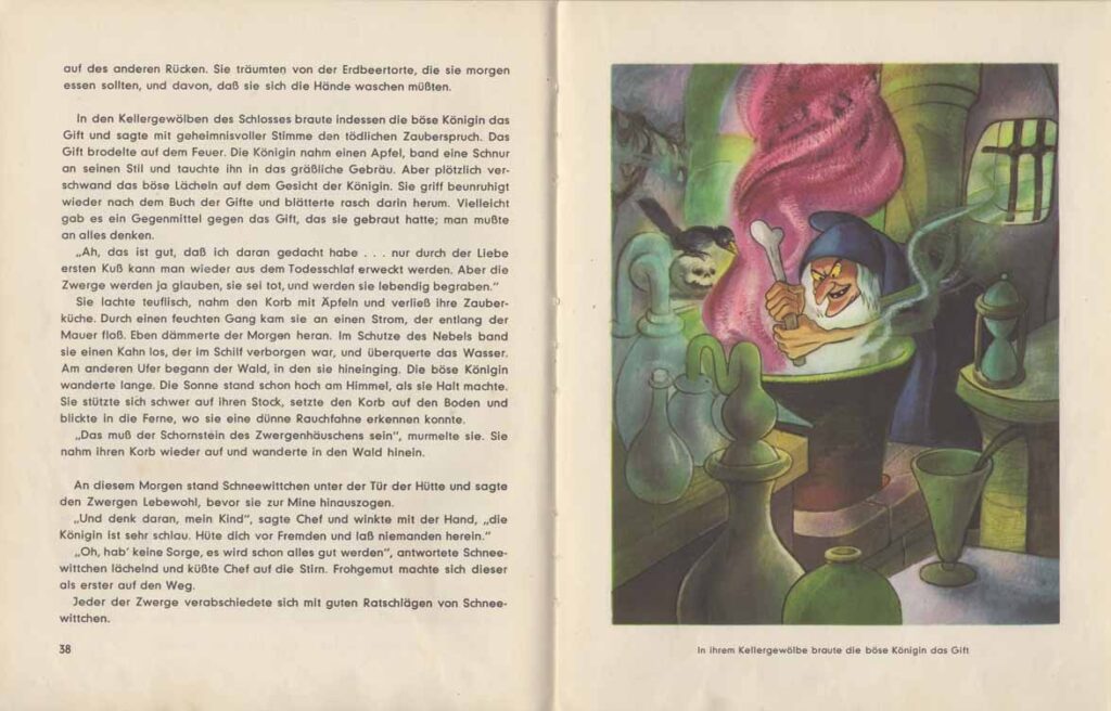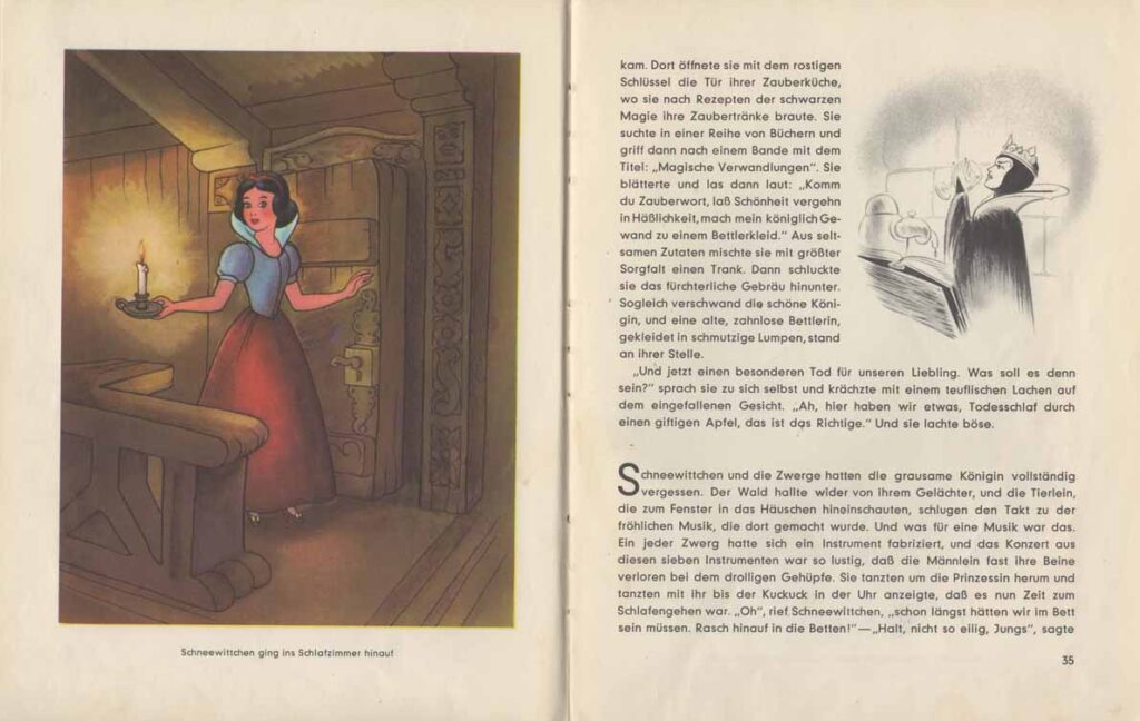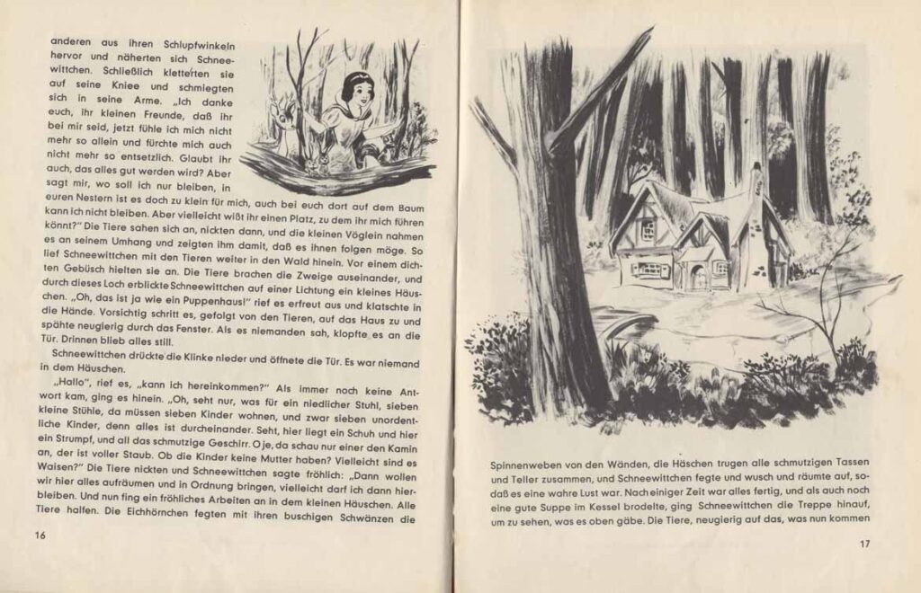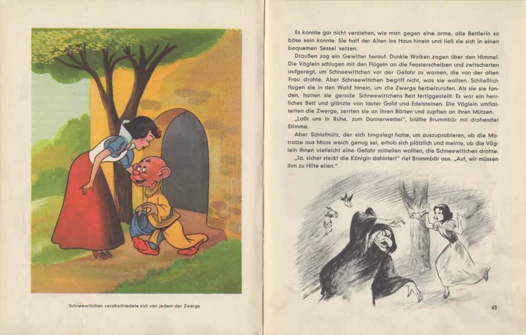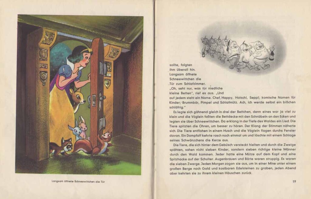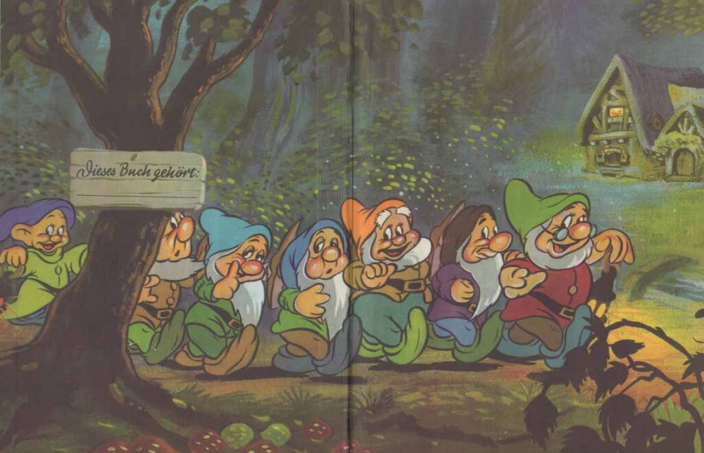 Here again, we find the cut scenes from the film that are usually present in book adaptations: Snow White’s mother, the construction of the bed, the witch mixing the contents of her cauldron with a femur. Notably, the book cover features the dwarfs to the detriment of the heroine, who is absent from the drawing.