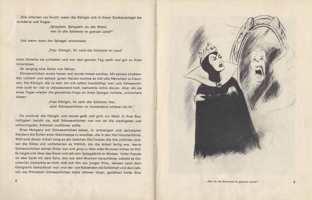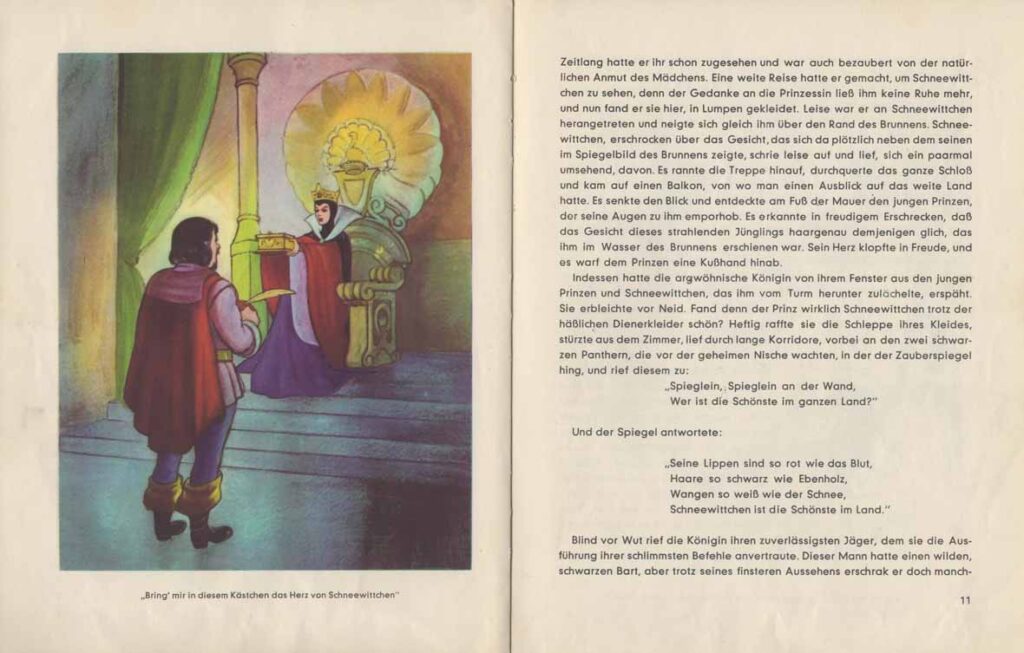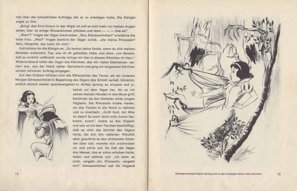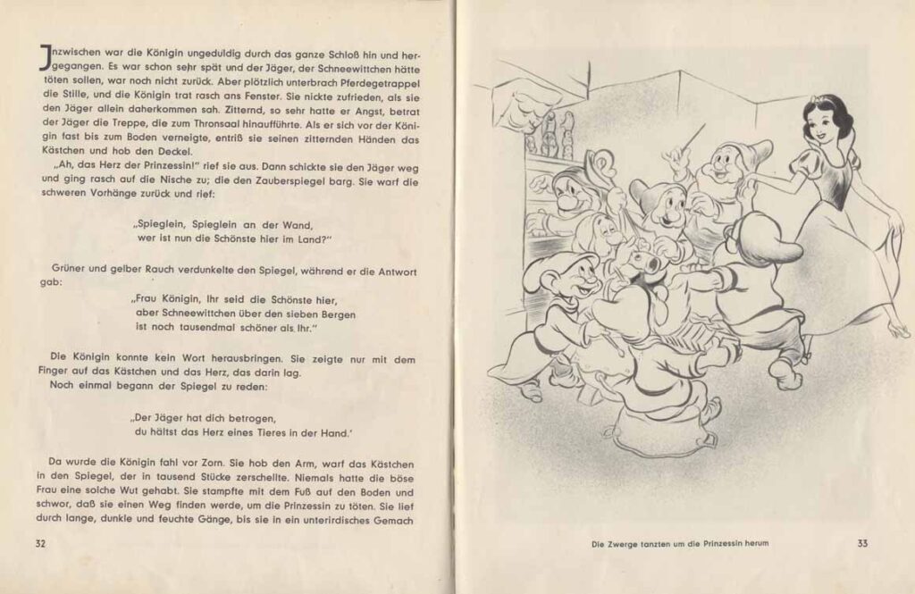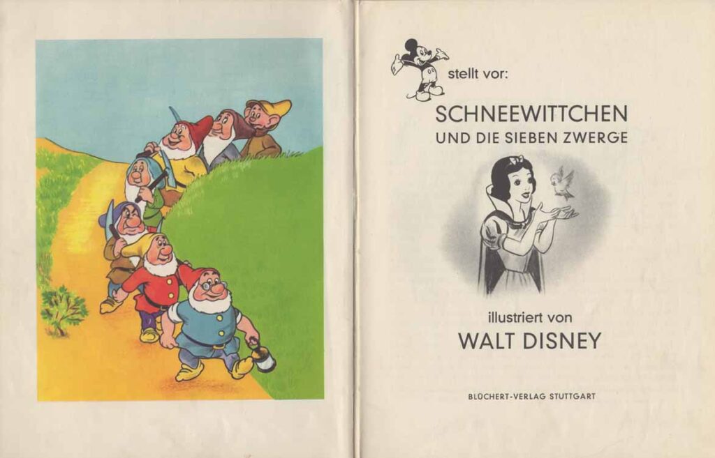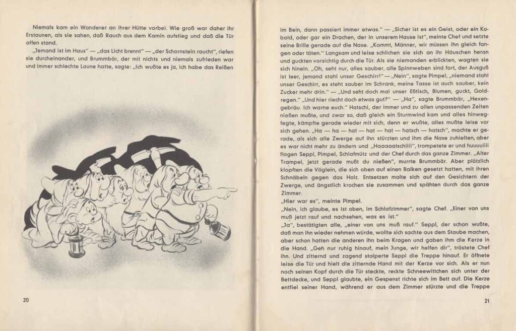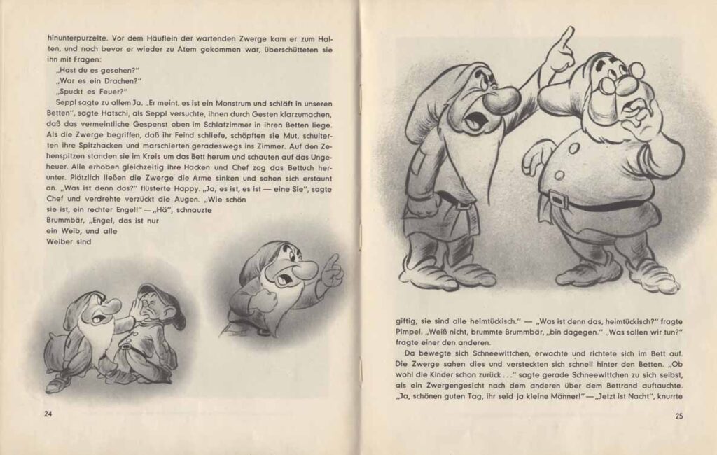 Here again, we find the cut scenes from the film that are usually present in book adaptations: Snow White’s mother, the construction of the bed, the witch mixing the contents of her cauldron with a femur. Notably, the book cover features the dwarfs to the detriment of the heroine, who is absent from the drawing.