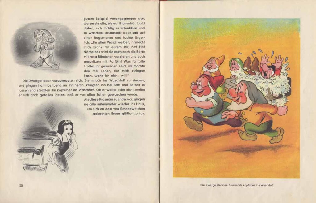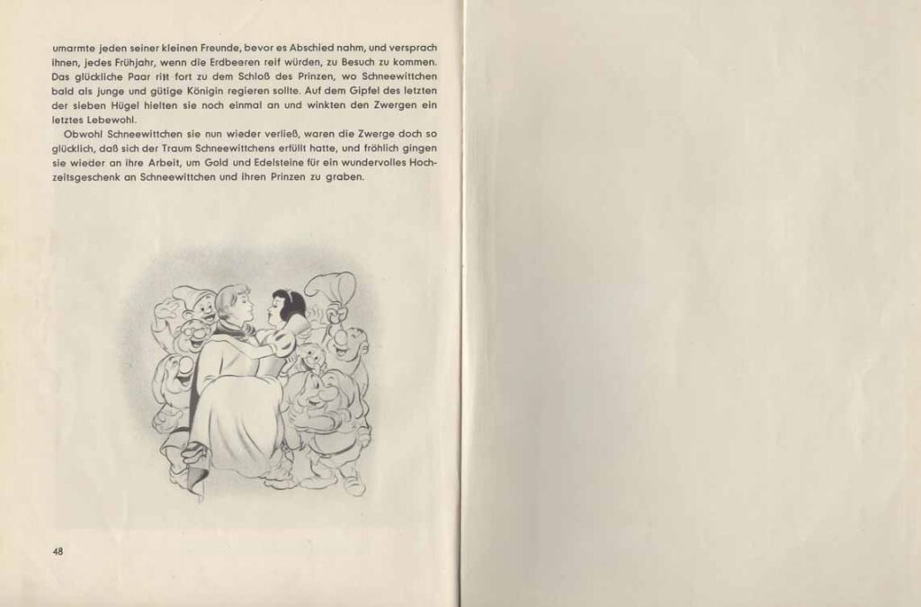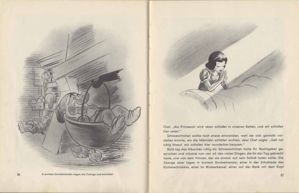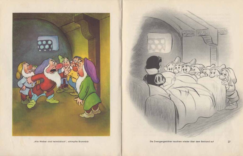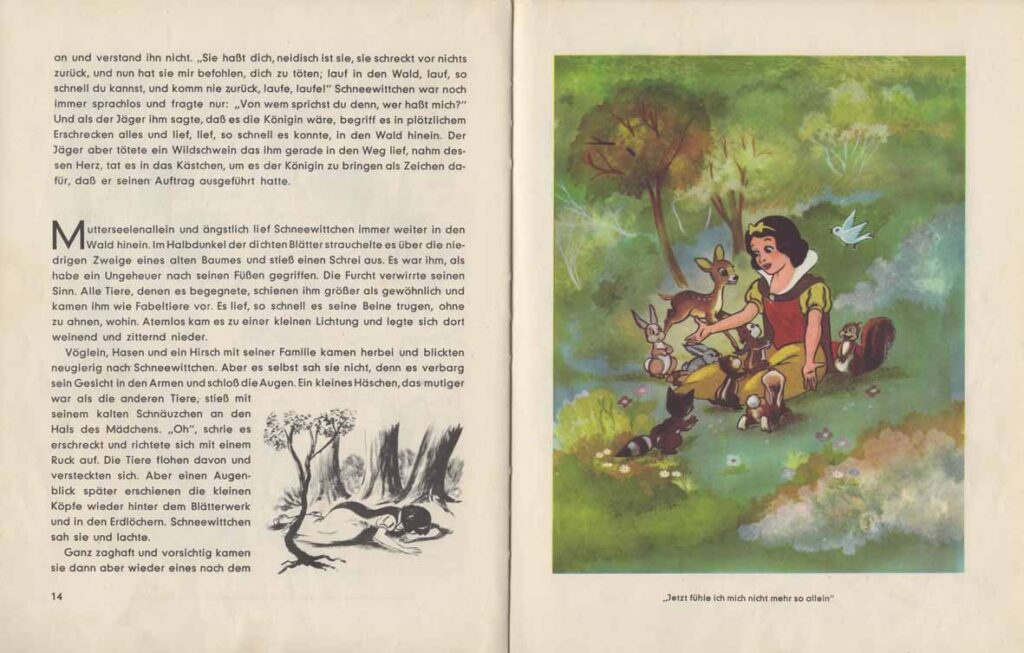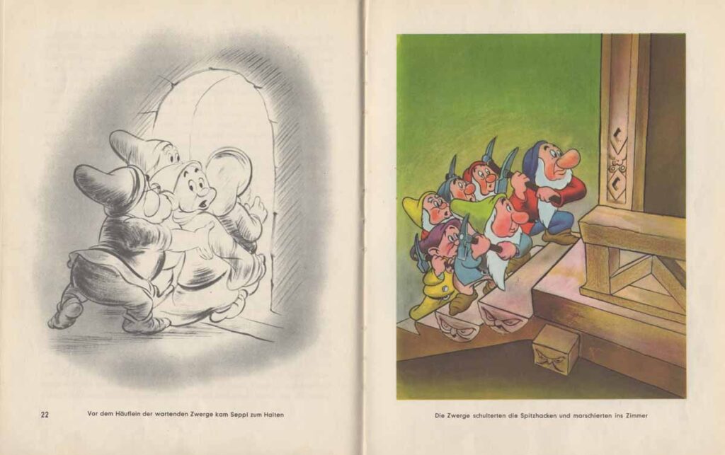 Although a German-language version of the film had been made since 1938, it was not released in Austria until 1948, and in Germany in 1950. It was then that this book came out in a format very similar to what had been released in France 12 years earlier in the Hachette collection, although there the similarity ends. While this is also mainly prose, with color and black & white illustrations, the latter appear to be original, although inspired by the studio’s own illustrations, notably those by Tom Wood. The dust jacket tells us that the same collection includes titles such as Pinocchio, Dumbo, Bambi, Cinderella, Bongo, Peter and the Wolf and others.