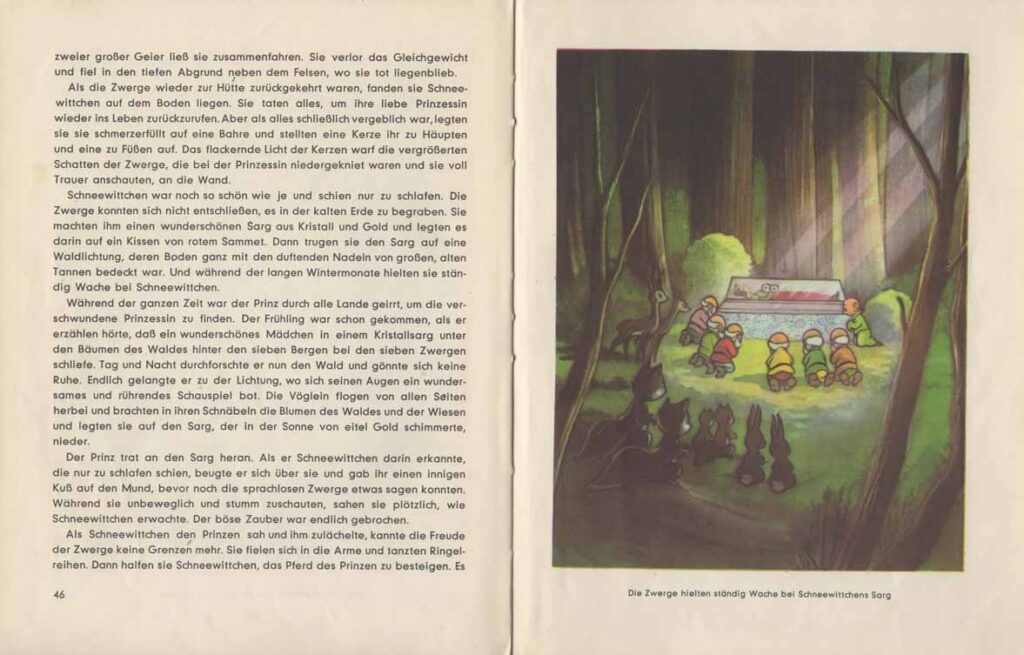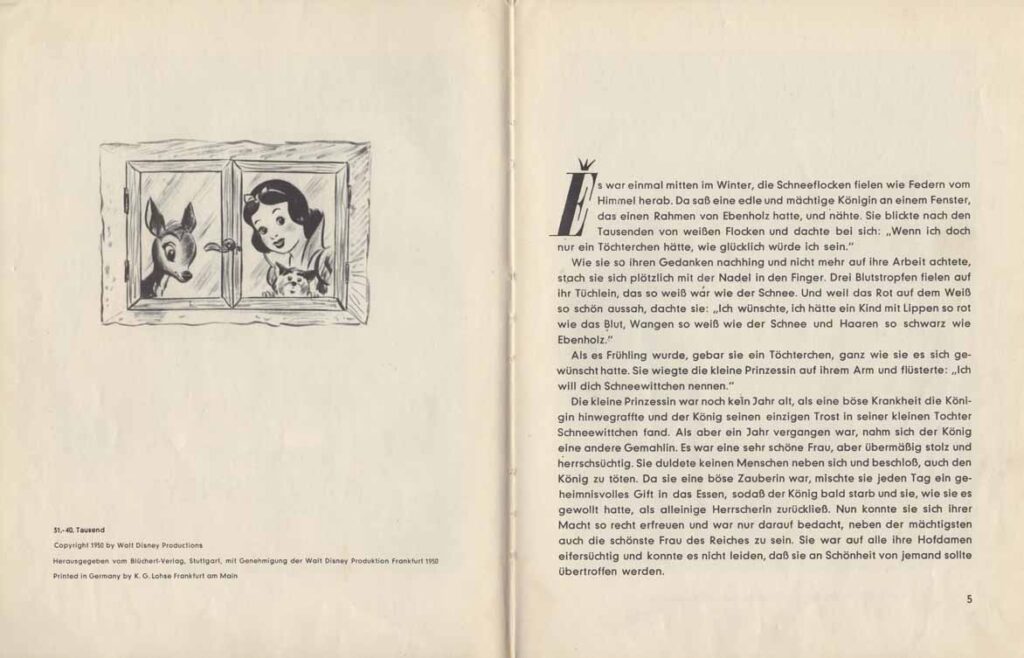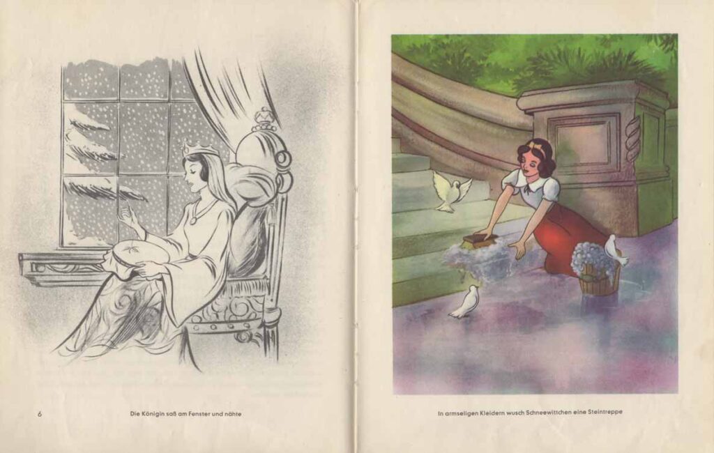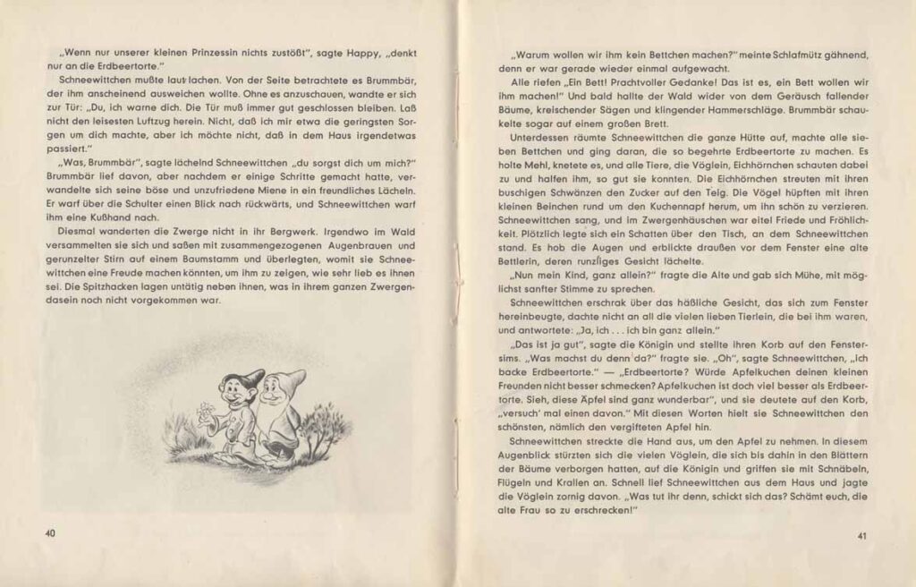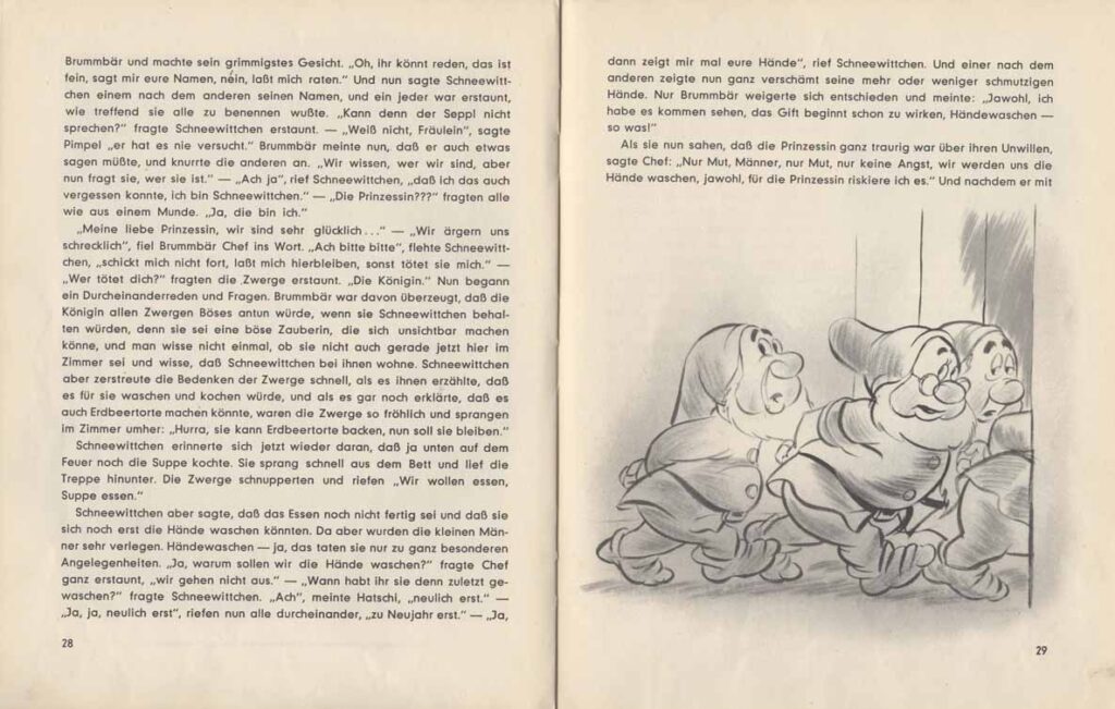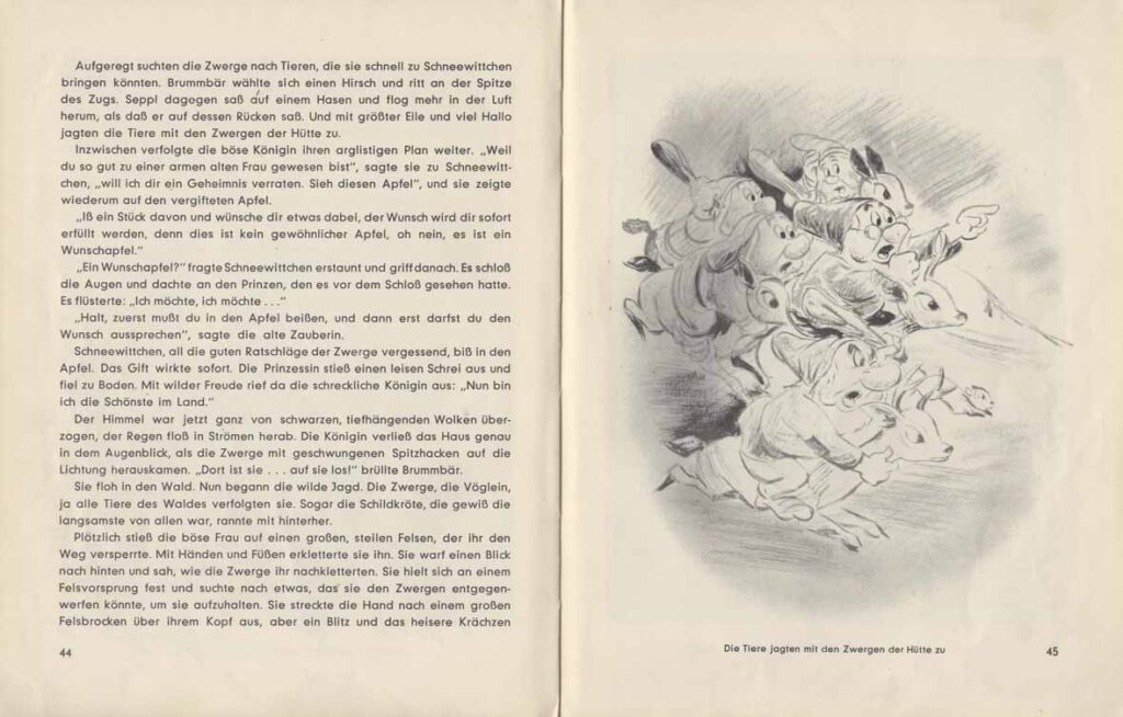 Although a German-language version of the film had been made since 1938, it was not released in Austria until 1948, and in Germany in 1950. It was then that this book came out in a format very similar to what had been released in France 12 years earlier in the Hachette collection, although there the similarity ends. While this is also mainly prose, with color and black & white illustrations, the latter appear to be original, although inspired by the studio’s own illustrations, notably those by Tom Wood. The dust jacket tells us that the same collection includes titles such as Pinocchio, Dumbo, Bambi, Cinderella, Bongo, Peter and the Wolf and others.