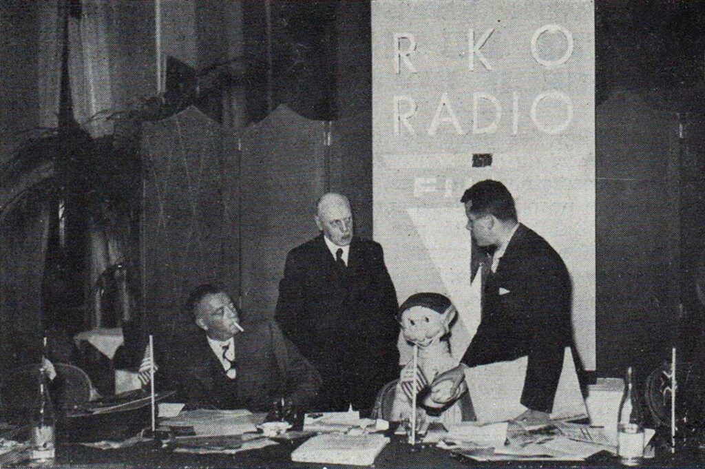 “A recent scene in war-talking Europe as RKO Radio’s foreign department convened its European representatives in Paris for a three-day meeting to discuss motion picture merchandising. At left are pictured some of the 40 men who attended, with General Manager Phil Reisman (digitally emphasizing a point) on hand from the home office. At his right is R. W. Feignoux, Walt Disney representative for Continental Europe; at his left, Reg Armour, RKO Radio Continental general manager, and W. B. Levy, Walt Disney European general manager. It was announced that RKO Radio’s European business as a whole had trebled the amount of the previous year.”