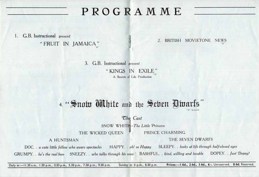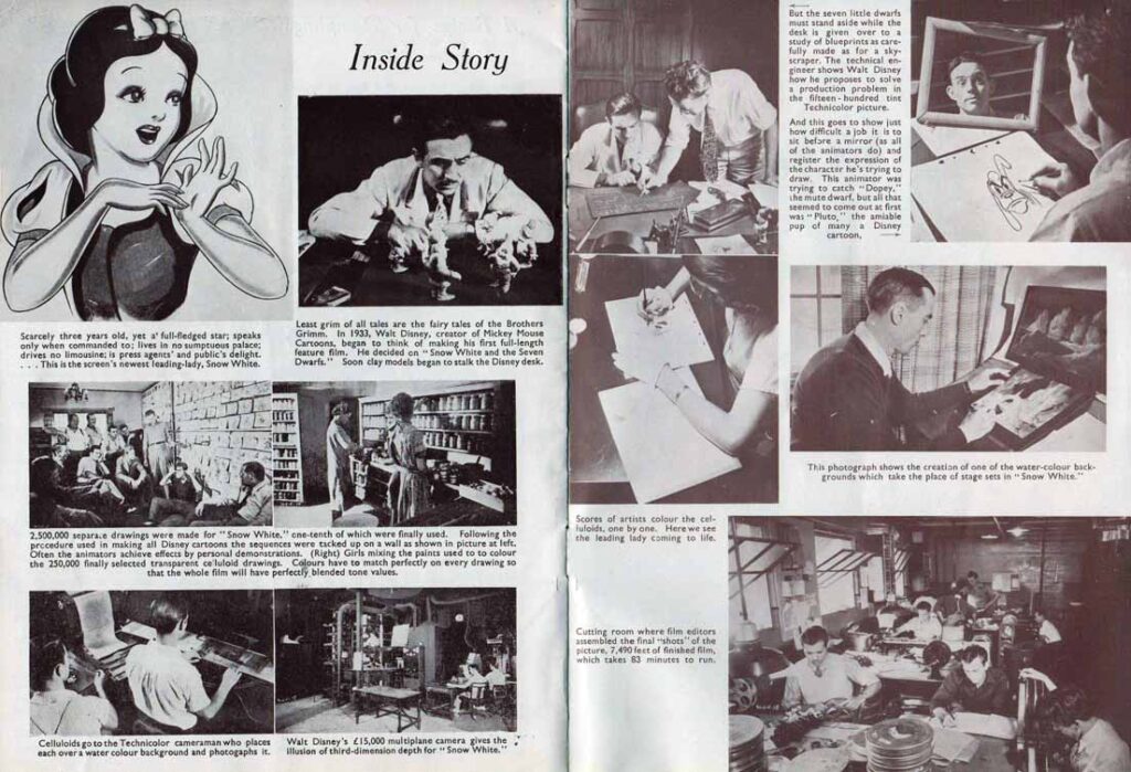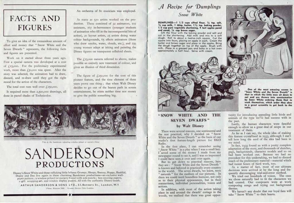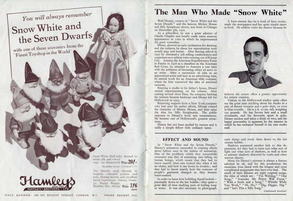 The program made for this premiere engagement bears many similarities with the New York program. Snow White and the Seven Dwarfs dolls are advertised for Hamleys toy shop, also on Regent Street. Snow White is sold for £20, £12,6 or £7,11 depending on its size, and each dwarf for £7,6. A biography of Walt Disney is offered, and trivia facts about the effects and sound are offered. The same blurbs about the planned foreign versions are used, and the same double page “Inside Story” with pictures showing the animation process is reproduced albeit with British spelling (“colour” instead of “color”).