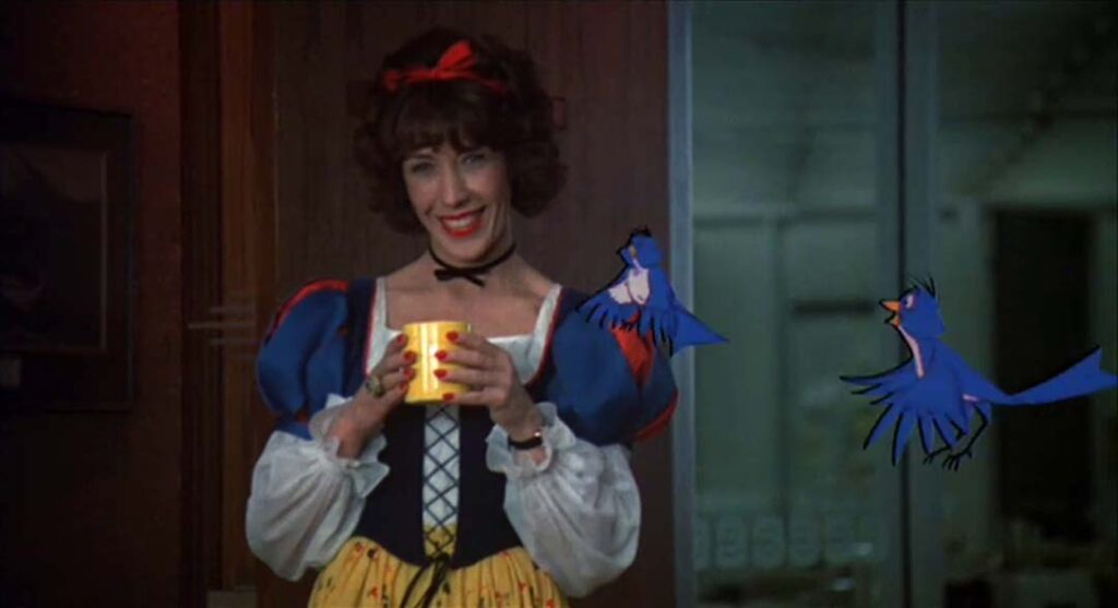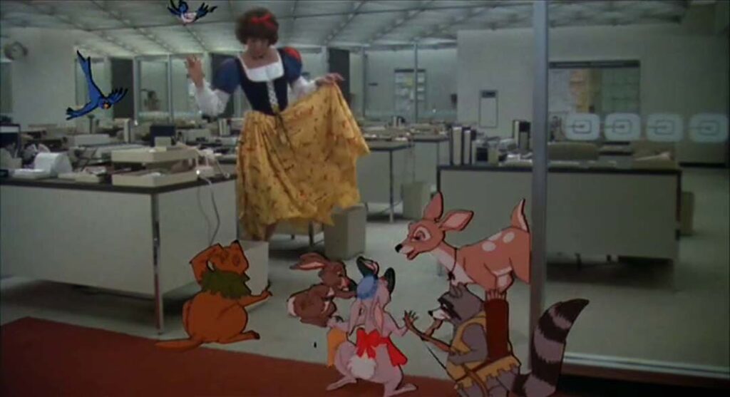 When Colin Higgins’s film Nine to Five was released, a full-page ad in Variety featured glowing review excerpts praising the movie. Most of them highlighted the scene where one of the three women dreaming of getting rid of their boss imagines it as a fairy tale. In her mind, a fairy tale seems to correspond primarily to Walt Disney’s Snow White and the Seven Dwarfs. And the critics picked up on the reference immediately. For instance, Robert Osborne wrote: “Surely one of the year’s wittiest treats is Tomlin dessed and coiffed like Snow White, surrounded by animated bunnies and bluebirds.”