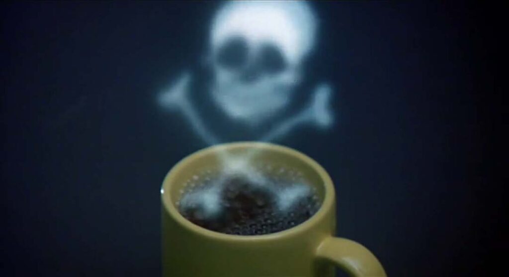 Indeed, the nods are plentiful. As the boss asks for his usual cup of coffee, Violet—played by Lily Tomlin—imagines herself dressed as a princess, surrounded by forest animals dressed like characters from Robin Hood, which had come out seven years earlier. Two bluebirds flutter around her and begin to whistle—one of them hitting a sour note and blushing with embarrassment, just like in Disney’s Snow White. In a very “Evil Queen” gesture, Violet pulls poison from a ring set with green stones—reminiscent of the Queen’s piercing green eyes—and a skull-shaped puff of smoke rises from the coffee as she pours it in, echoing the skull that appears on the Queen’s poisoned apple in Snow White.