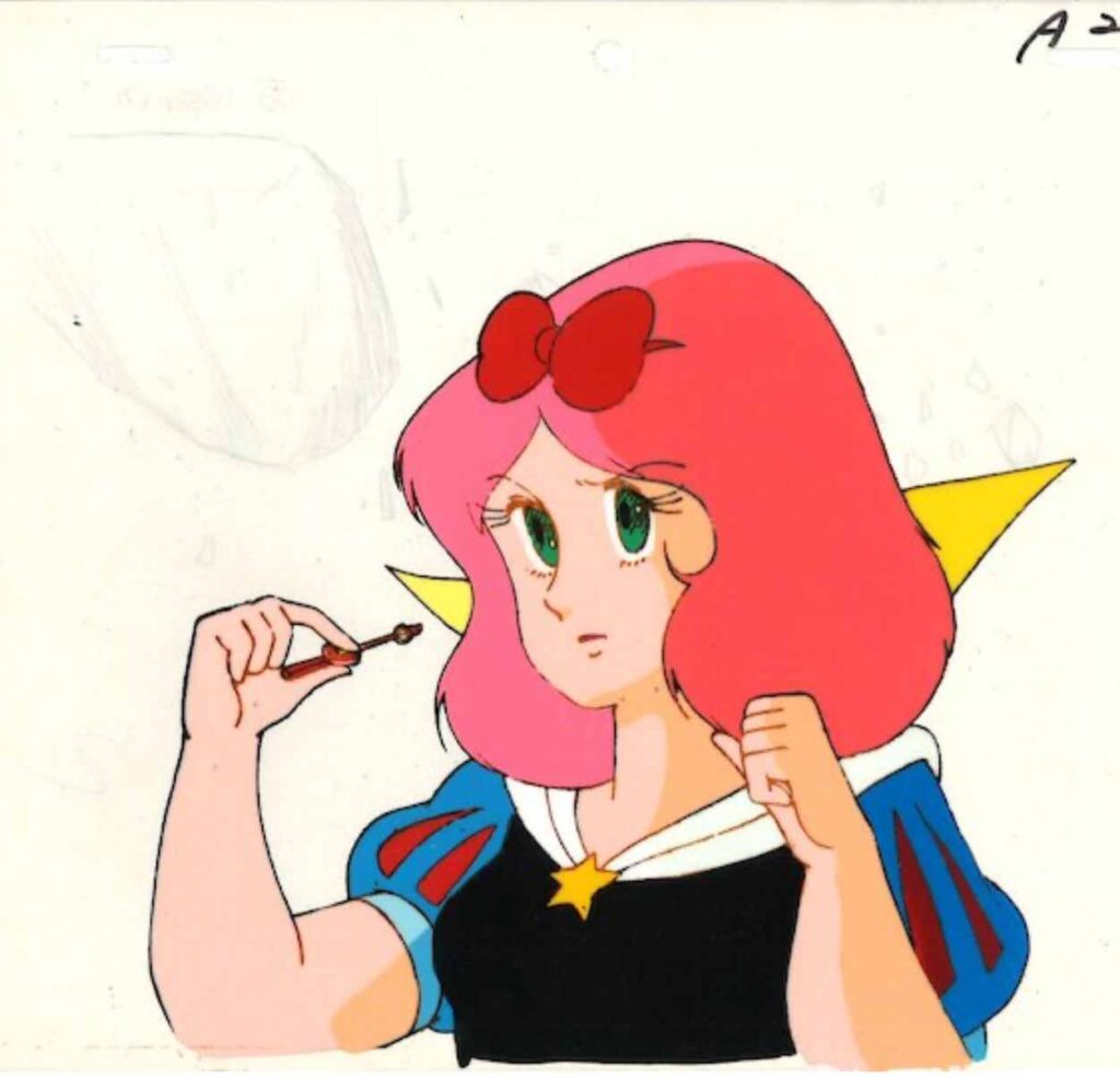 To help her, she has animal companions and a magic wand that enables her to transform into an adult. Every time she brings joy to someone, a magic crown glows in Fenarinarsa. As she gets close to her aim, she loses her magical powers in episode 45 and dies in episode 46. A new baby is then, sent to earth by the King and the rest of the series is the dream of that baby. Four episodes after that directly reference Snow White and the Seven Dwarfs. Episode 50 entitled Beware of Apples, aired February 24, 1983, episode 55 entitled Love (Love), Apple Again, aired March 31, 1983, episode 61 entitled Love (Love) Apple Forever aired May 12, 1983 and episode 62 entitled Looming Shadow aired May 19, 1983. The latter is a reference to the show’s theme song “Love Love Minky Momo”.