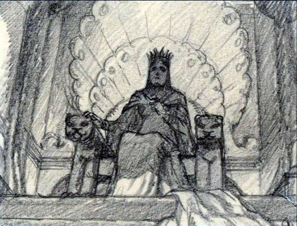 À ce stade du développement, le film s’ouvrait encore sur la Reine marchant dans un corridor vers son miroir, accompagnée de sa panthère et de ses gardes.