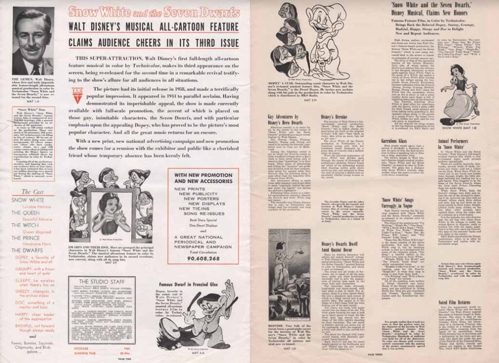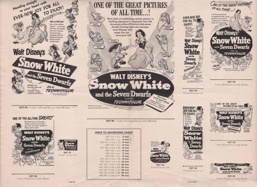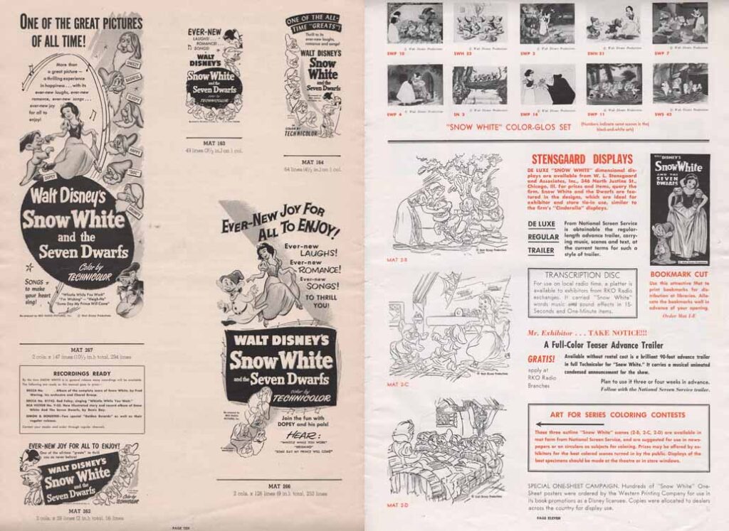 “Available without rental cost is a brilliant 90-foot advance trailer in full Technicolor for Snow White. It carries a musical animated condensed announcement for the show. Plan to use it three or four weeks in advance.”