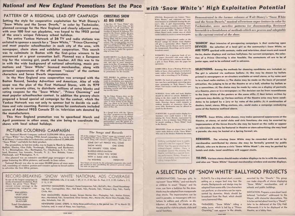 The December 25, 1951 TV special “One Hour in Wonderland” is mentioned which contained Snow White scenes and music and apparently gathered an estimated 25,000,000 people! The Lux Radio Theaters carried announcements for the film on December 24 and 31. Adriana Caselotti appeared on the December 24 program. She also appeared on the Edgar Bergen show on the CBS network on December 23. New books from Simon & Schuster, Dell Publishing Company, Whitman Publishing Co. come out. Exhibitors are encouraged to order a transcription disc for use on local radio time with messages in 15 seconds and one minute.