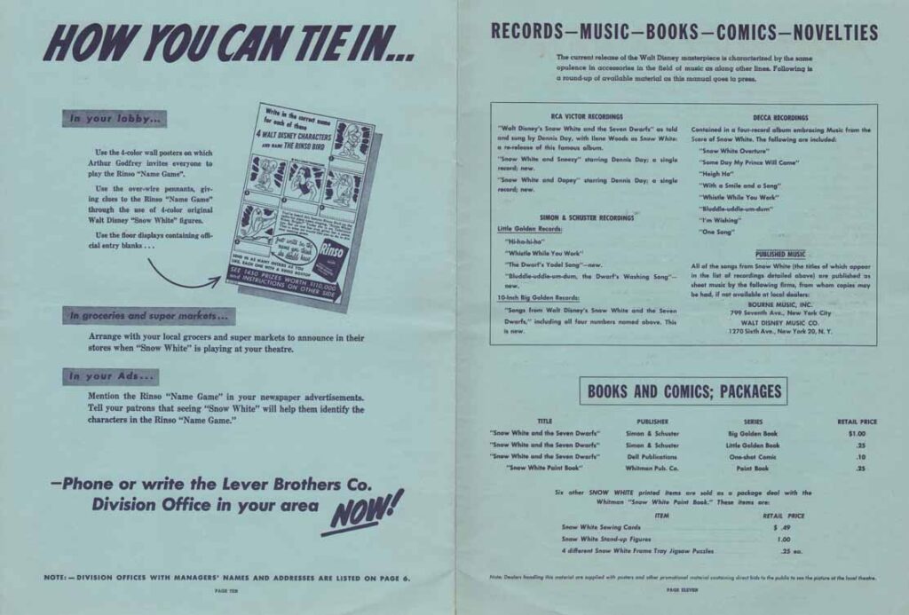 This RKO Campaign Book has been made for the 1952 re-release of Snow White and the Seven Dwarfs, the film’s third issue. It is 12 pages long and has a 12-page supplement that focuses on licensee merchandise, the most important of which seems to have been Bendix and Rinso.