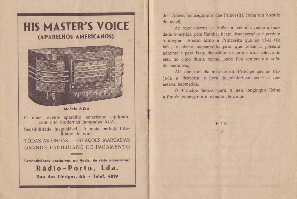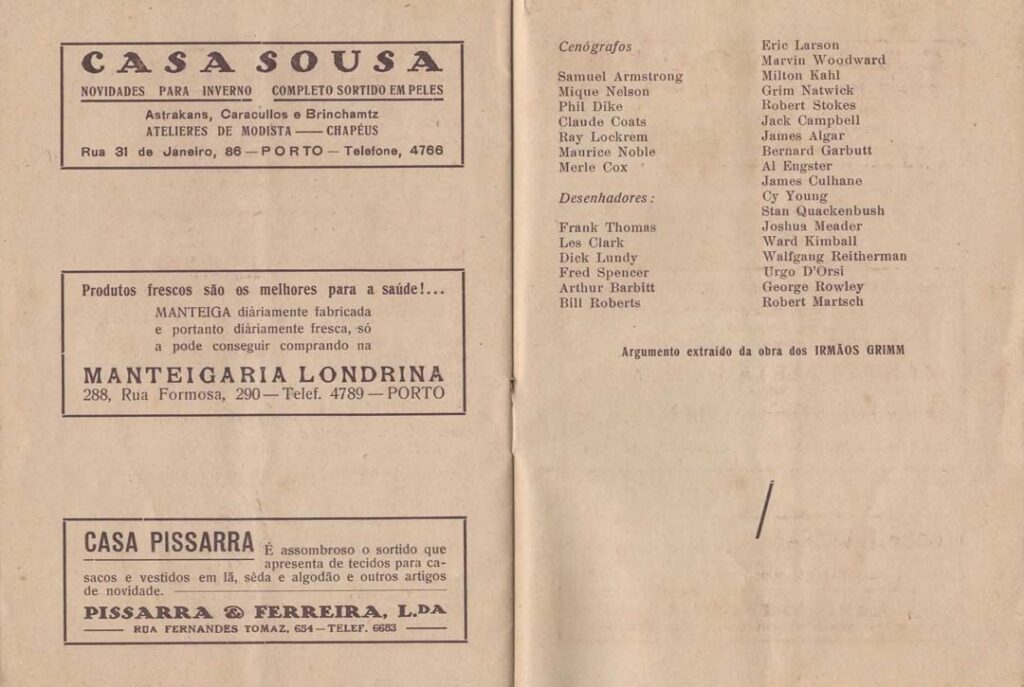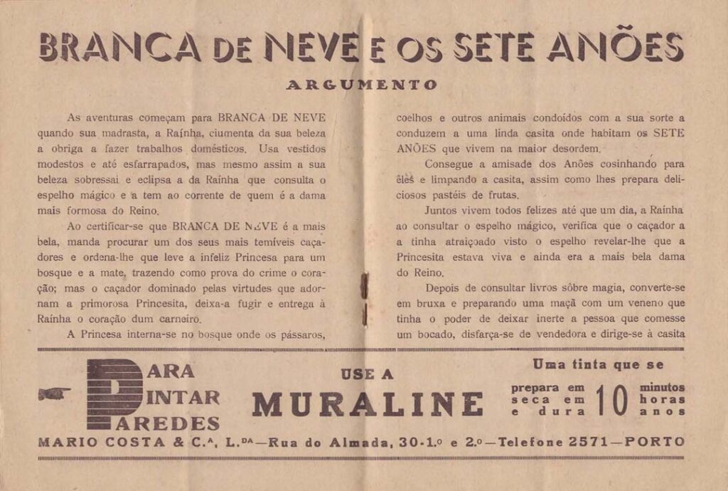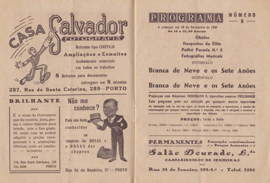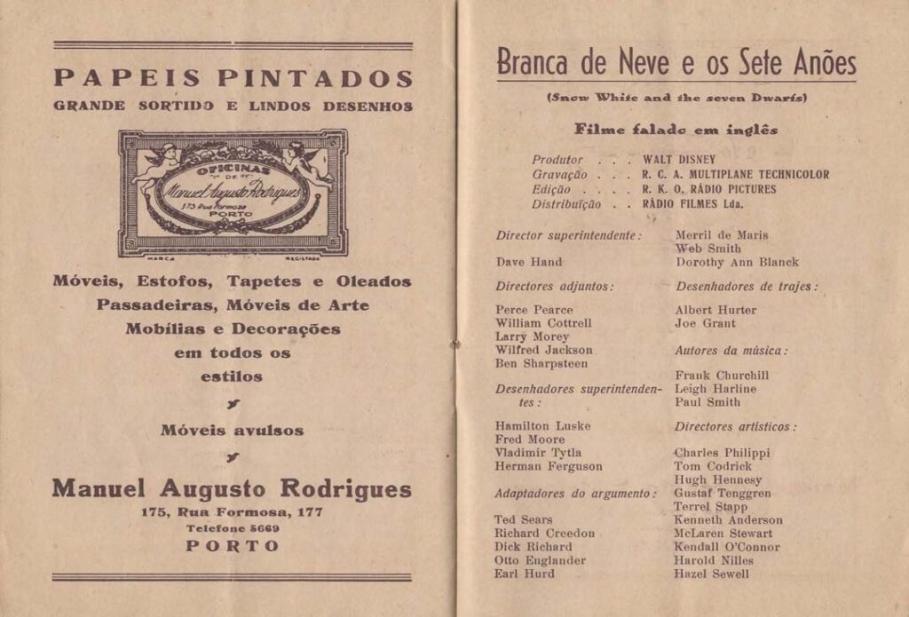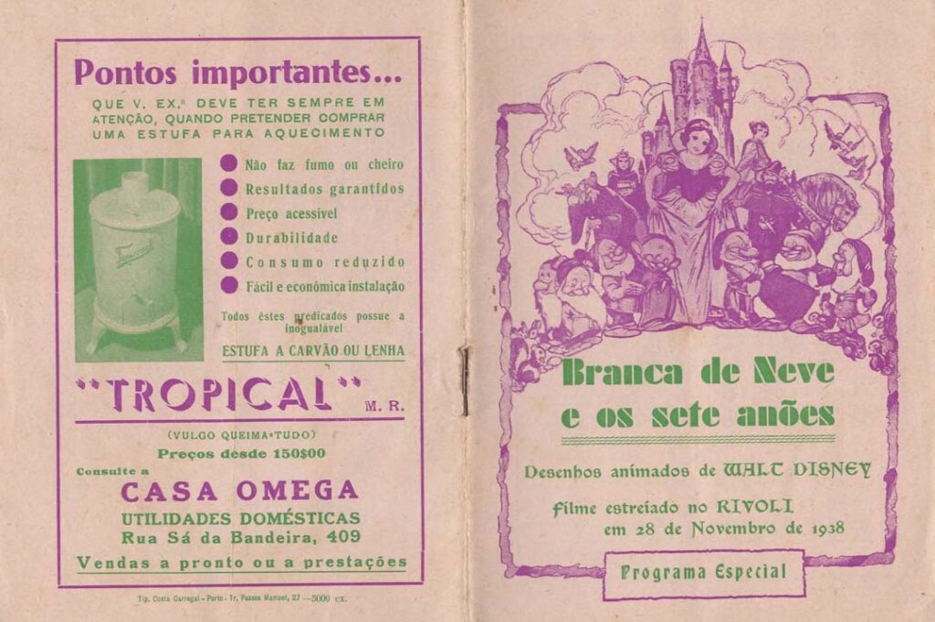 On November 28, 1938, Snow White and the Seven Dwarfs comes out in Porto, Portugal, at the Rivoli Theater. For this engagement, 5000 copies of this “special program”, printed by Costa Carregal are handed out. The film runs at 4 pm and 9.30 pm every day.