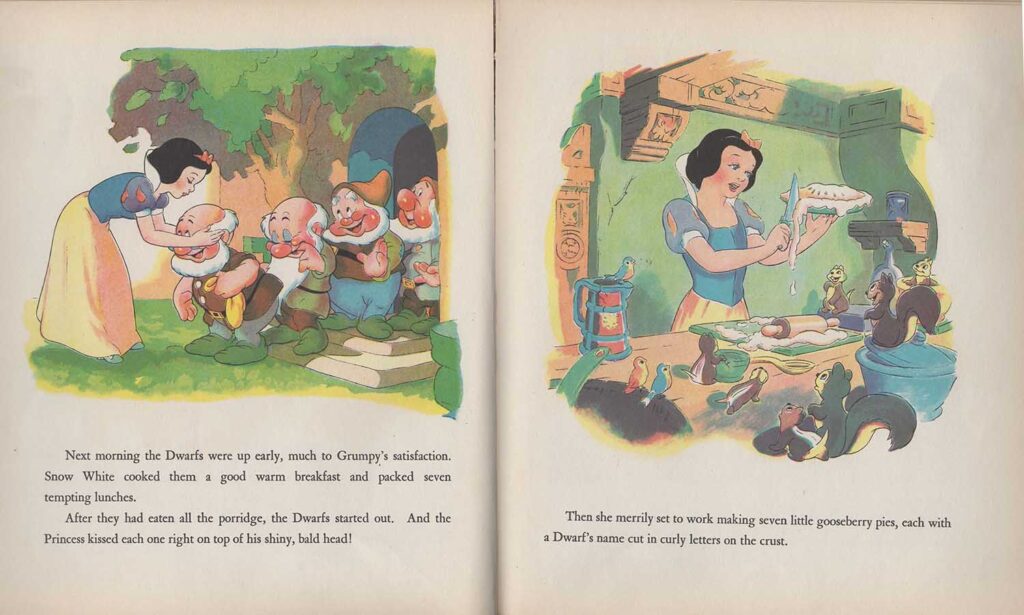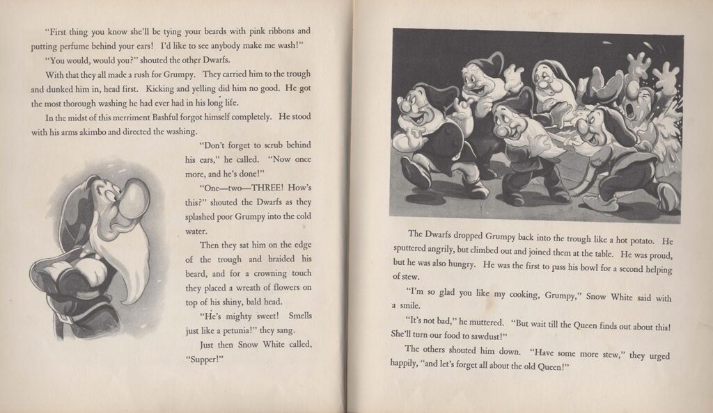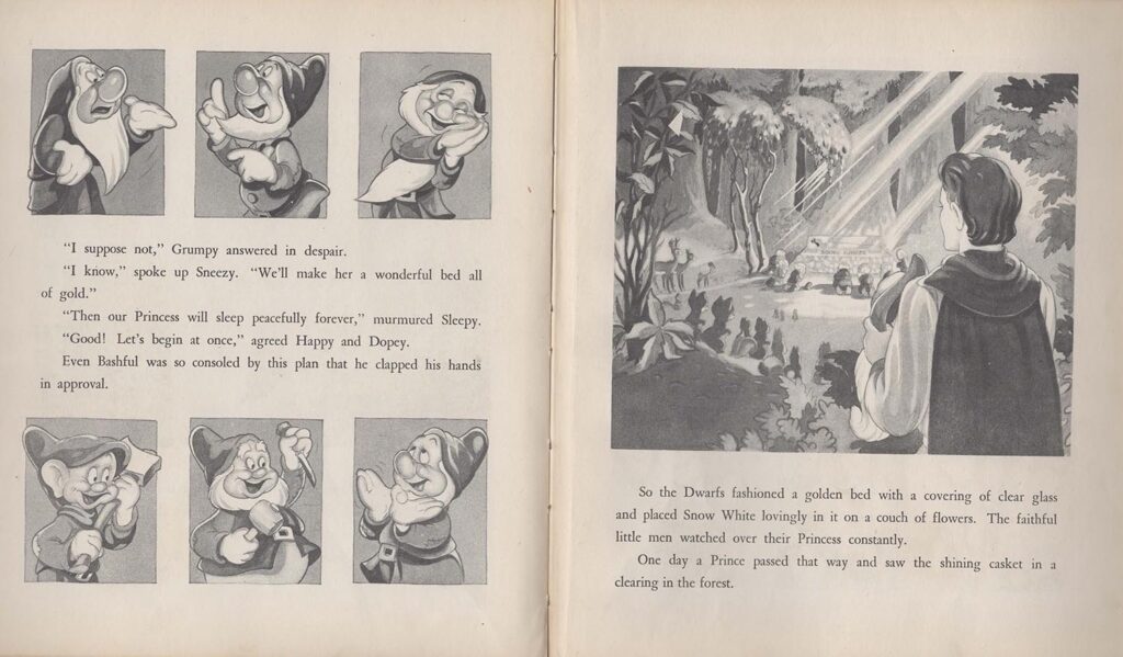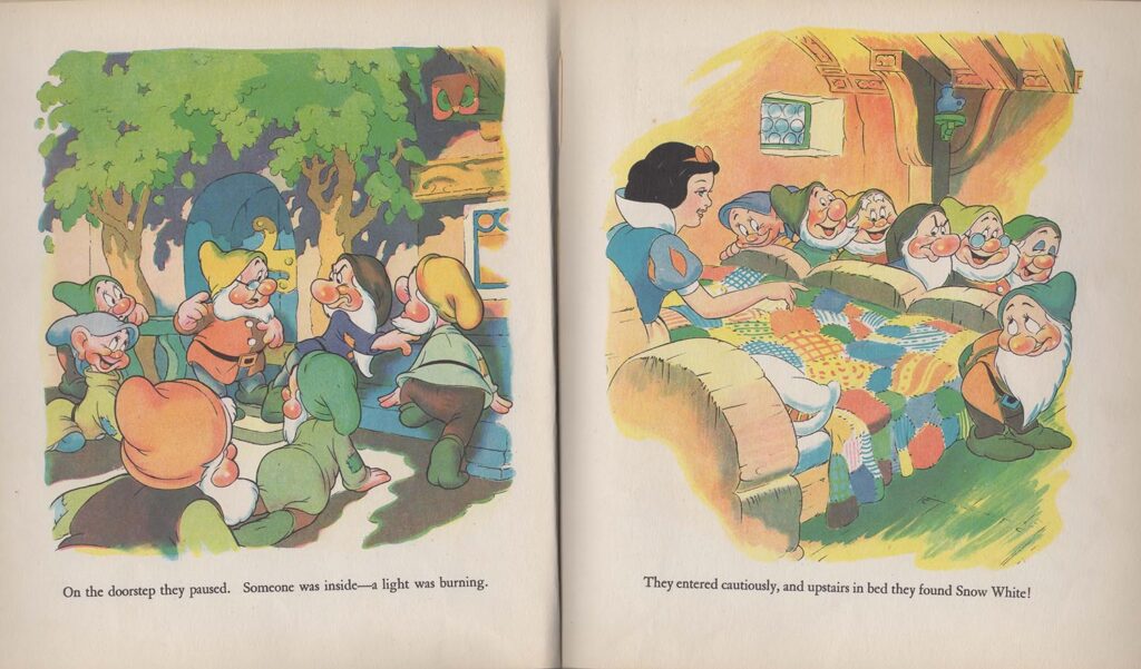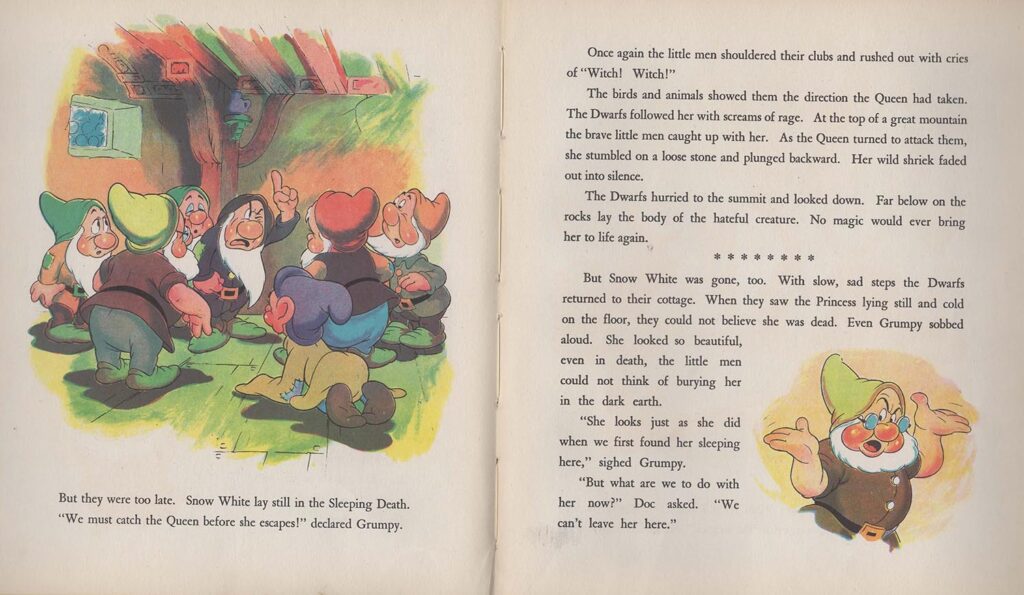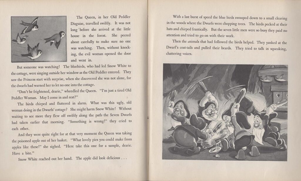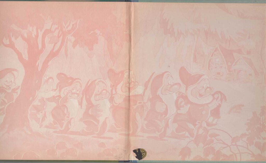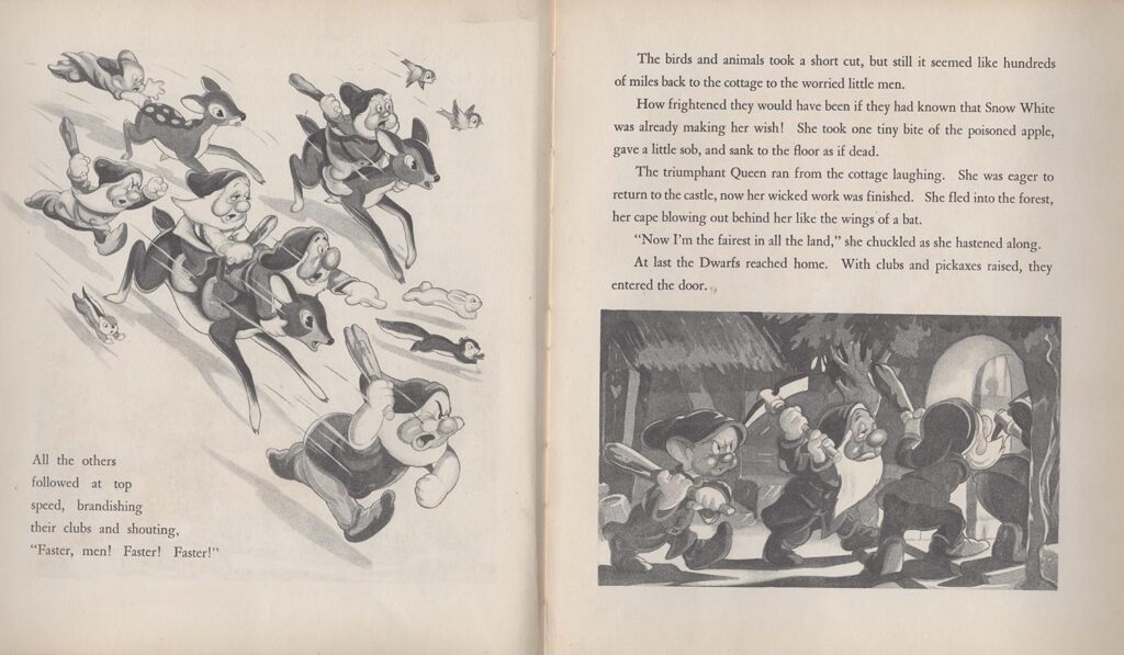 Although strongly inspired by the studio’s drawings, the illustrations seem to have been specifically made for this book, although no artist, once again, is credited. It is likely to be Tom Wood’s style. Most of the illustrations in this book will be reused in all media in more or less repurposed versions through the decades. However, several of them are bizarrely used here to depict other scenes than those originally intended. Indeed, an image of Sneezy making a pillow for Snow White’s bed is placed over the text describing the dwarfs going to bed. The dwarfs hitting Dopey, fearing he is a ghost, is used to illustrate the animals’ warning of the Queen’s presence. Instead of the dwarfs chasing the Queen, an illustration of the little men cautiously entering their cottage with pickaxes is taken from an earlier scene, etc. The most disturbing thing is to see the smiling dwarves rejoicing as they discuss the bed to be built for Snow White when this illustration is used here when the decision is made to build her a coffin!