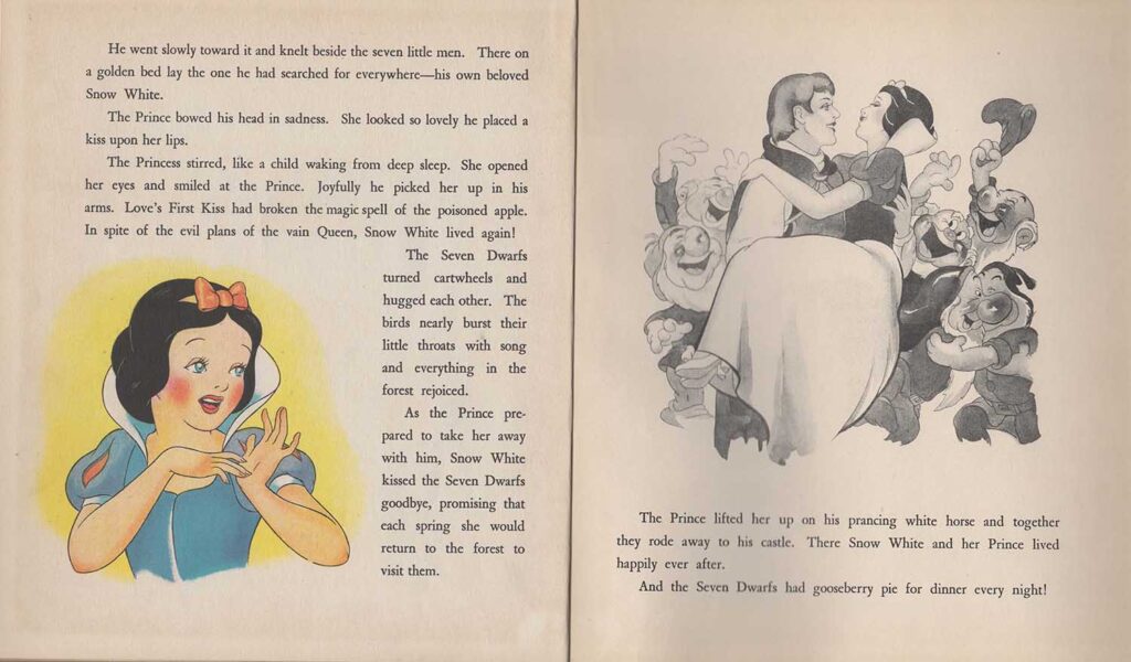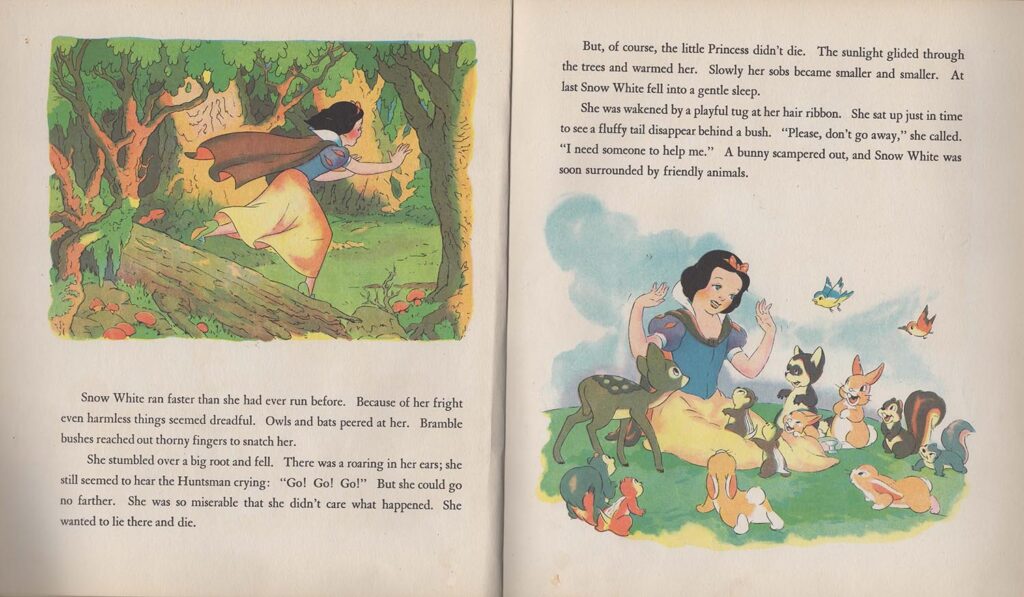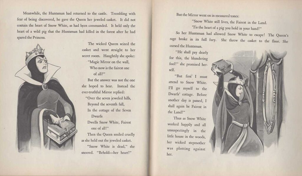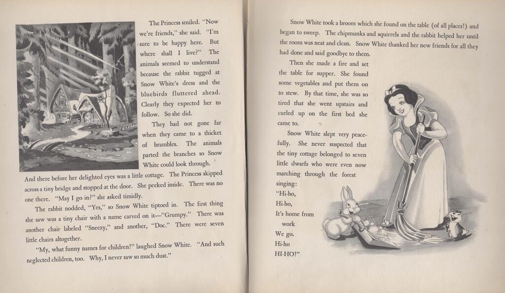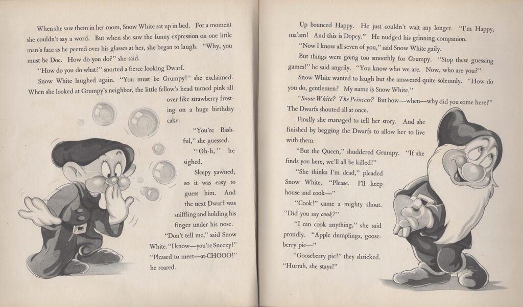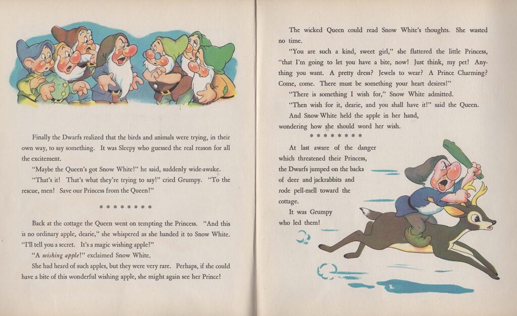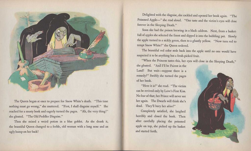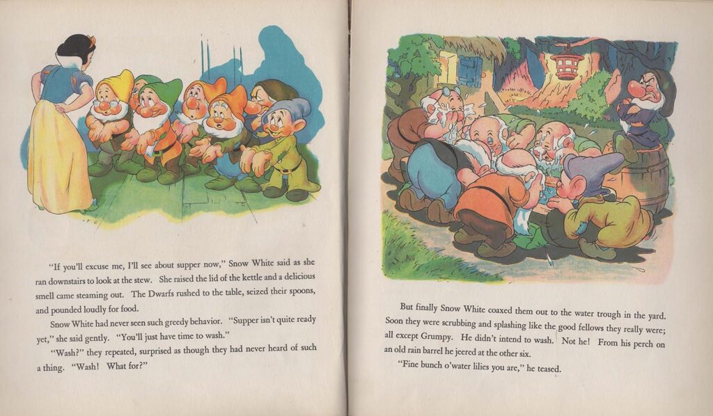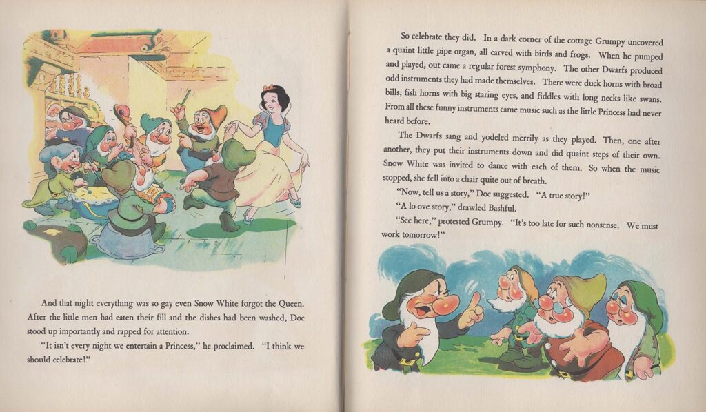 Although strongly inspired by the studio’s drawings, the illustrations seem to have been specifically made for this book, although no artist, once again, is credited. It is likely to be Tom Wood’s style. Most of the illustrations in this book will be reused in all media in more or less repurposed versions through the decades. However, several of them are bizarrely used here to depict other scenes than those originally intended. Indeed, an image of Sneezy making a pillow for Snow White’s bed is placed over the text describing the dwarfs going to bed. The dwarfs hitting Dopey, fearing he is a ghost, is used to illustrate the animals’ warning of the Queen’s presence. Instead of the dwarfs chasing the Queen, an illustration of the little men cautiously entering their cottage with pickaxes is taken from an earlier scene, etc. The most disturbing thing is to see the smiling dwarves rejoicing as they discuss the bed to be built for Snow White when this illustration is used here when the decision is made to build her a coffin!