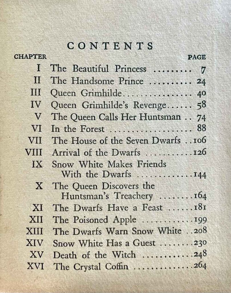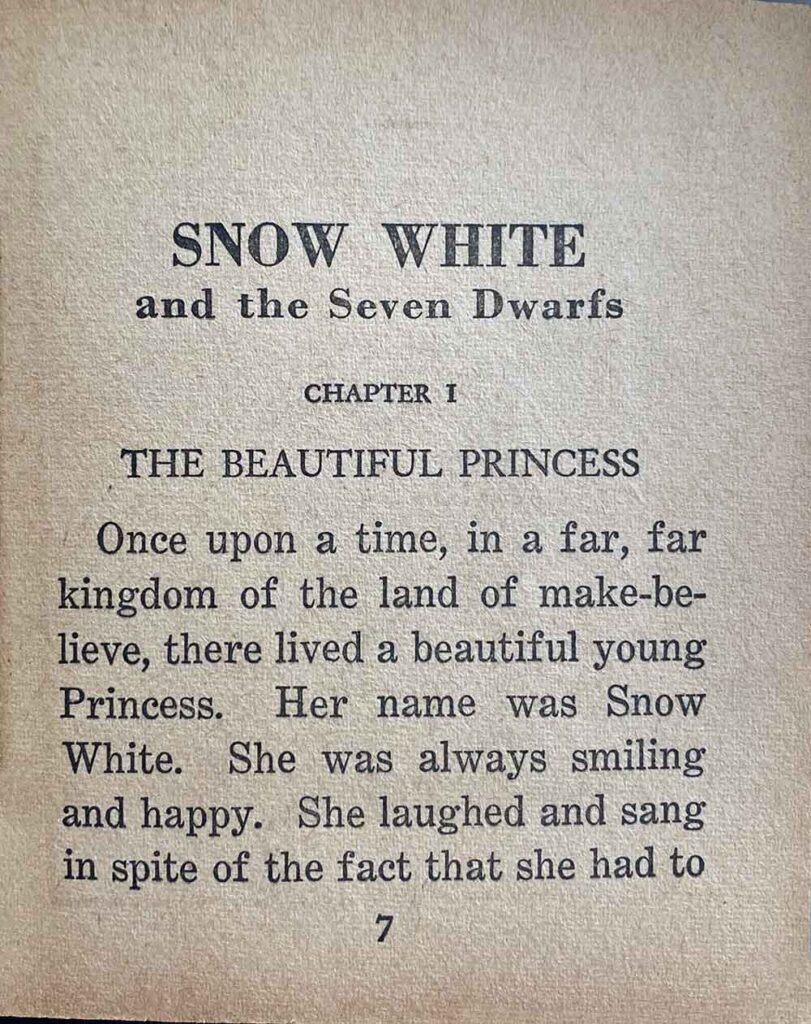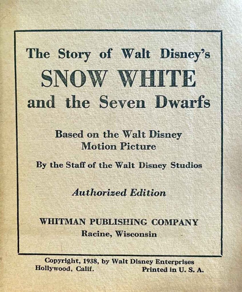 This 284-page, 16-chapter hardcover book came out in the United States in 1938. Its originality lies in its format which, as its name indicates, is thick and small. The publisher is listed on page 1 as “Whitman Publishing Company, Racine, Wisconsin,” along with the copyright: “1938, Walt Disney Enterprises, Hollywood, Calif.” The book was printed in the United States. No author is credited.
