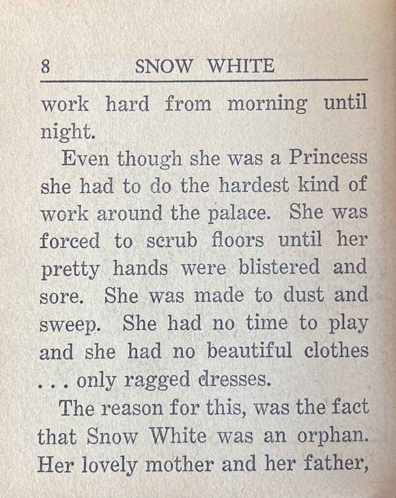 The premise of the book, by the way, is to lay out the story in prose on one page, and as a picture on the facing page (on the right for the overwhelming majority). Rather than the phylacteries of the comic book, the dialogue is transcribed here under the image. It should be noted that Snow White seems to keep a costume closer to that of her first appearance as a scullery maid with a Peter Pan collar and a lace, without a cape, even in the forest.