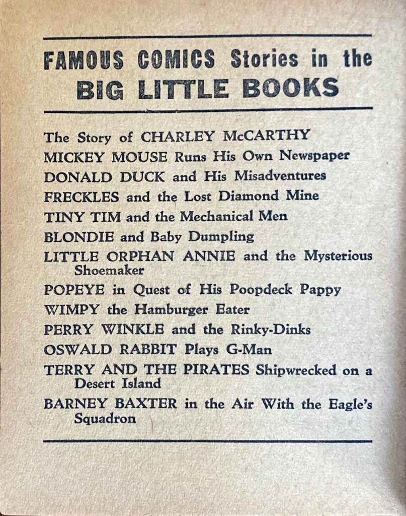 The story here includes several ideas discarded from the final footage such as the “Bucket Prince” or the construction of Snow White’s bed. The last three pages of the book are advertisements to buy other Big Little Books from Disney, Oswald, Popeye, Flash Gordon or western heroes.
