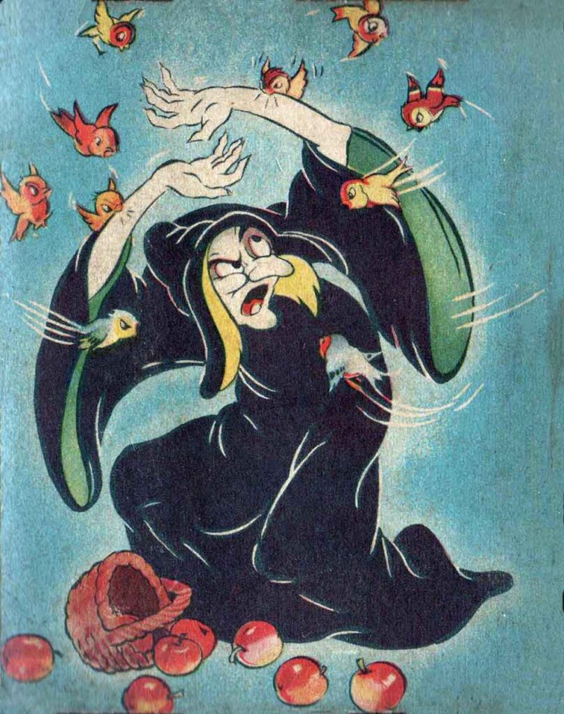 No illustrator is credited. The front cover is once again a version of Gustaf Tenggren’s drawing that was used for the movie poster, this time on a yellow background. The Queen visible on a red background on the spine, the witch on a blue background on the back cover and all the images in the book seem to be taken directly from the comic strip by Hank Porter.