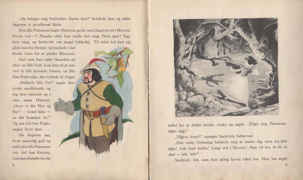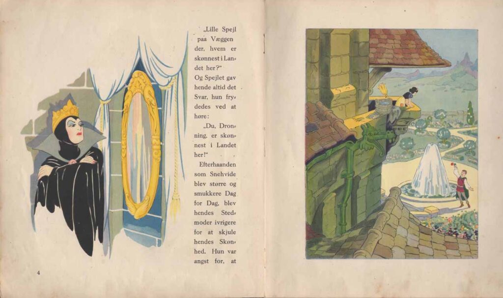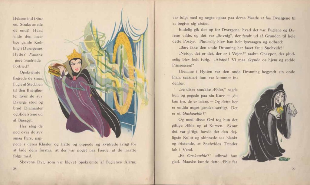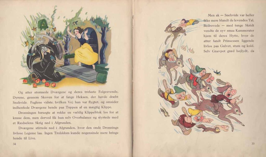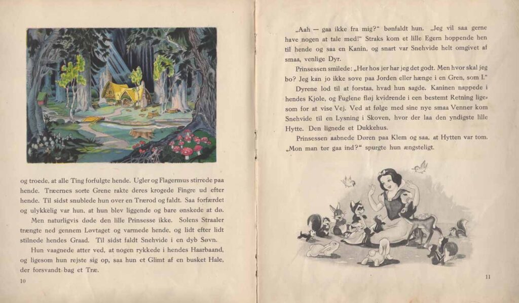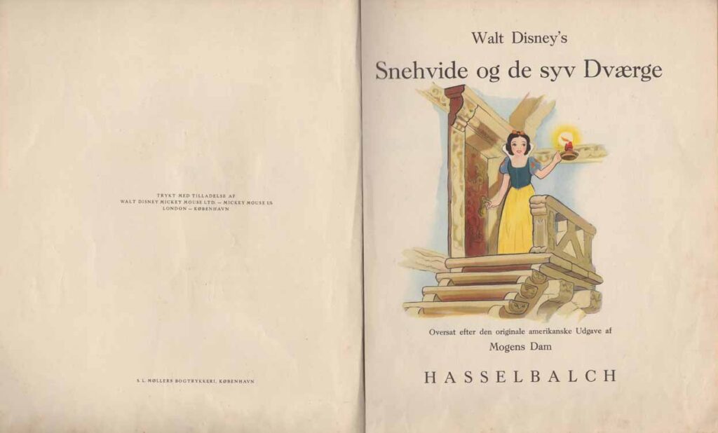 This storybook was published in Denmark in 1938 by Hasselbalch, Copenhagen and printed by S.L. Moller with the authorization of Walt Disney – Mickey Mouse Ltd. The story of Snow White was adapted from the American text by Mogens Dam, a playwright, screenwriter and lyricist who later collaborated on the 1966 LP of Snow White with Grethe Mogensen.