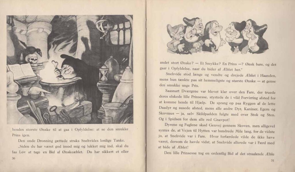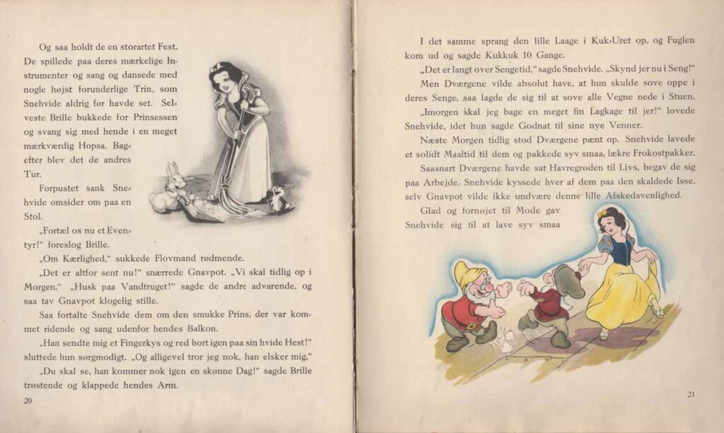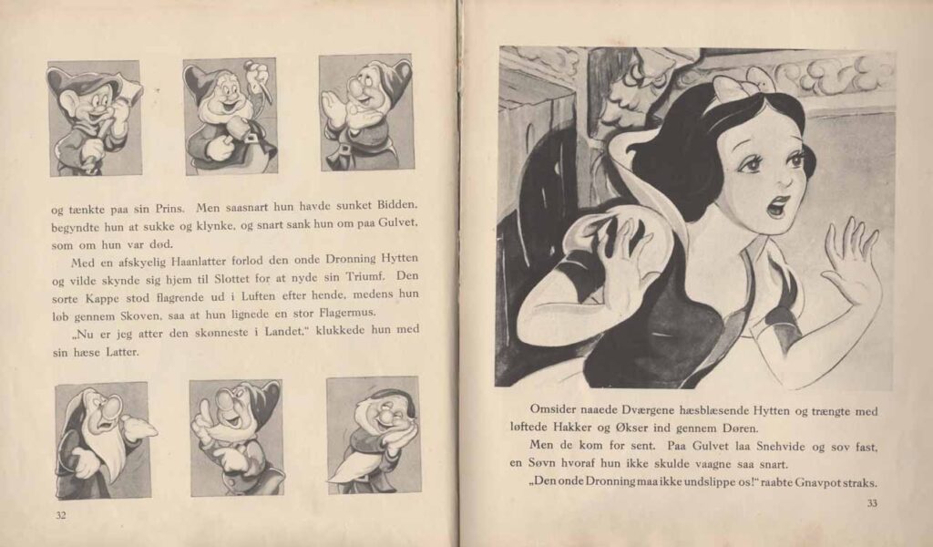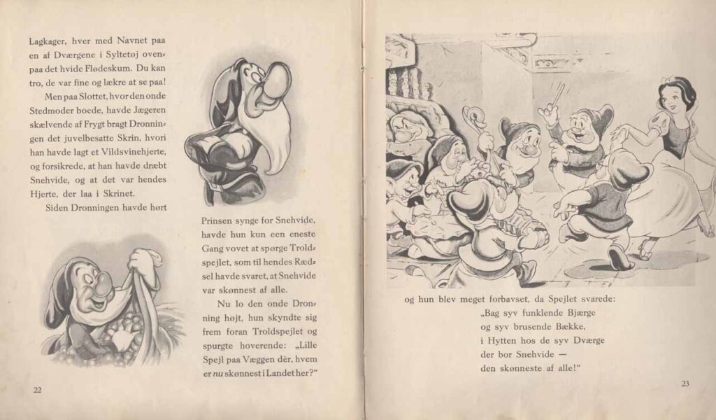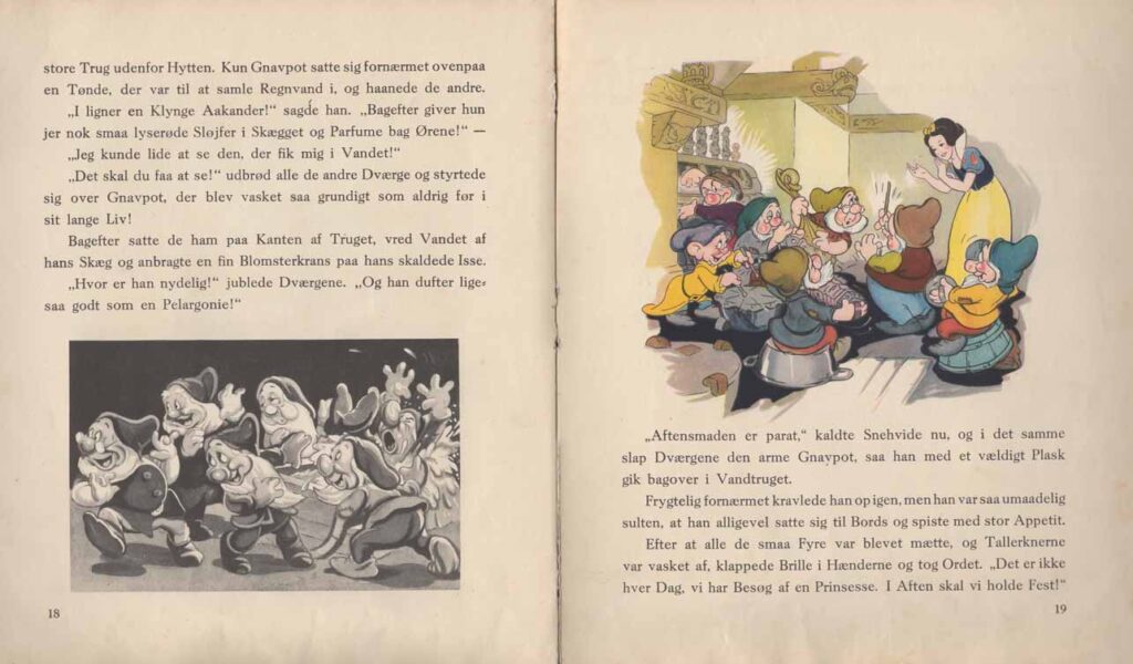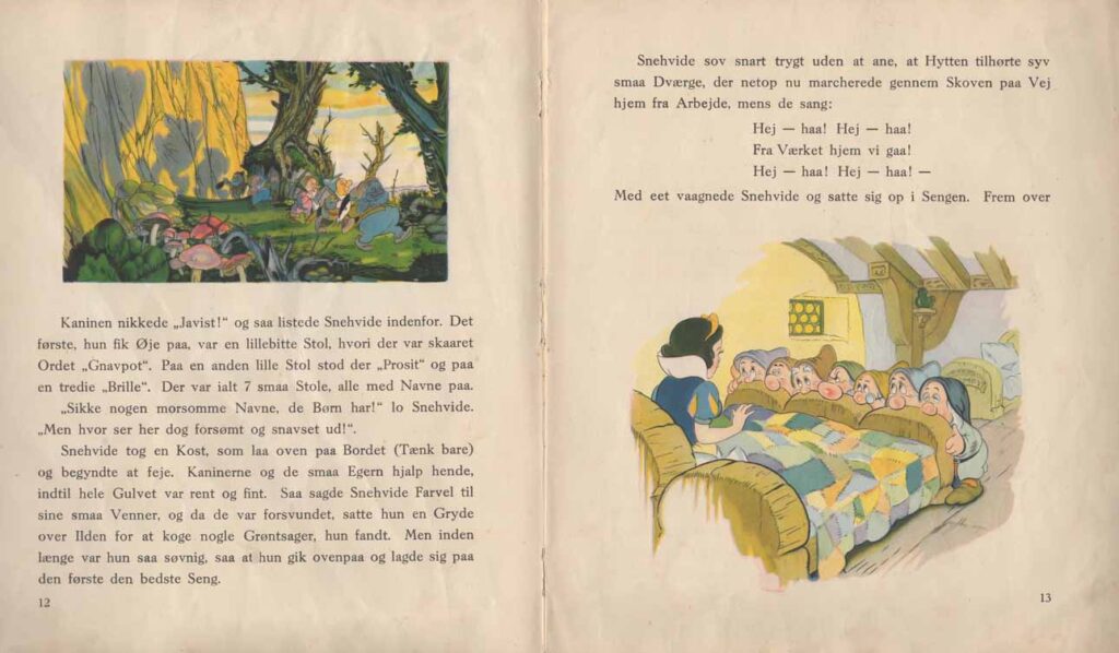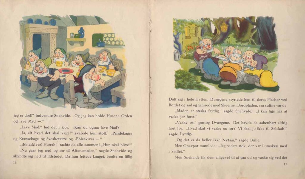 The book is inspired by the American book published David McKay, and the covers are very similar, although the drawings inside the book differ somewhat. The title in Danish is “Snehvide og de syv dværge”.