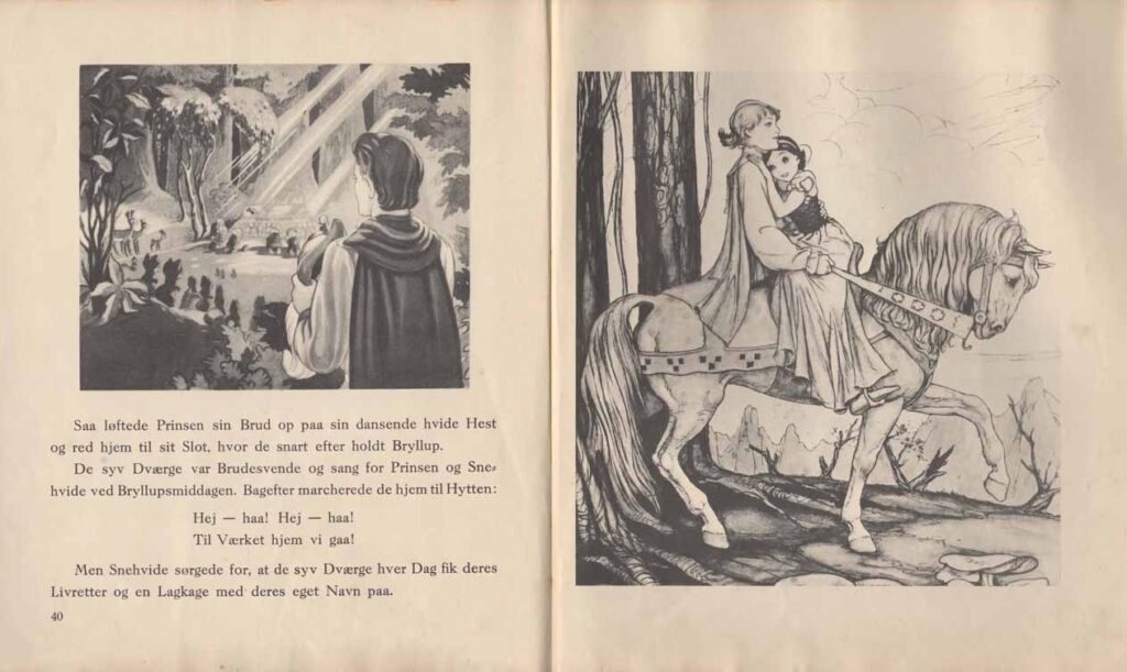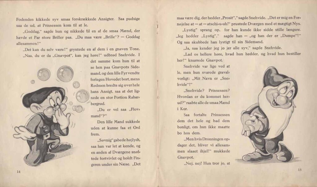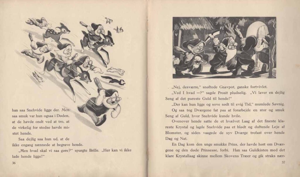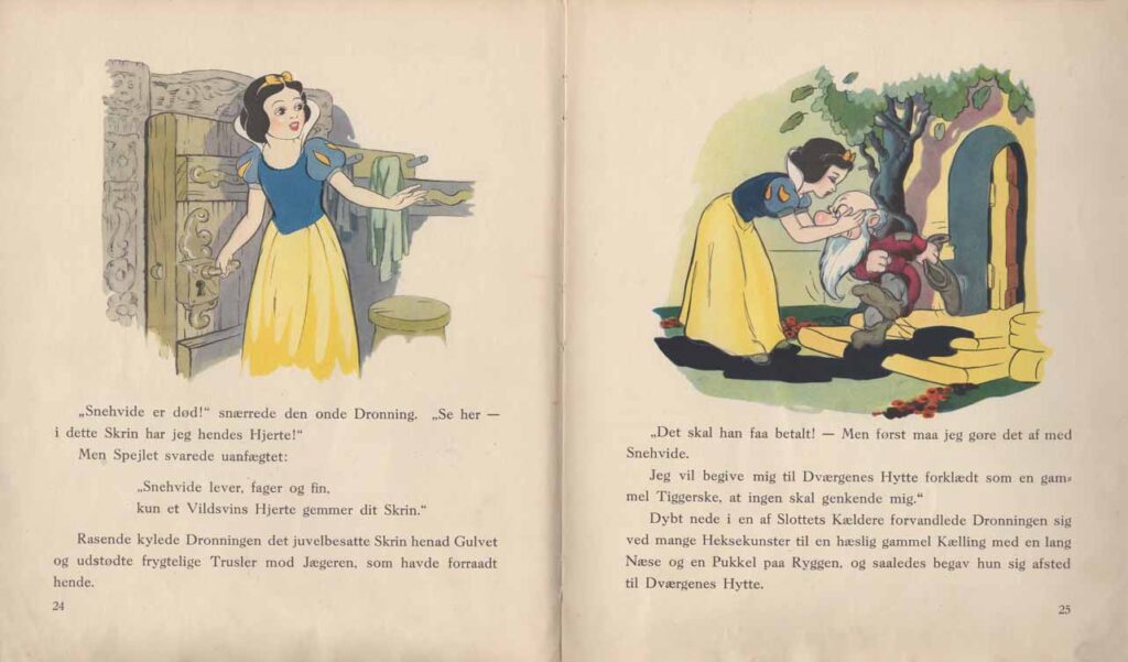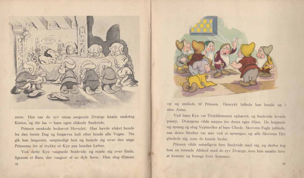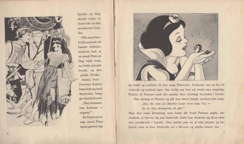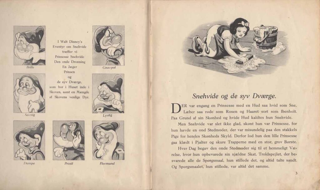 The book is inspired by the American book published David McKay, and the covers are very similar, although the drawings inside the book differ somewhat. The title in Danish is “Snehvide og de syv dværge”.