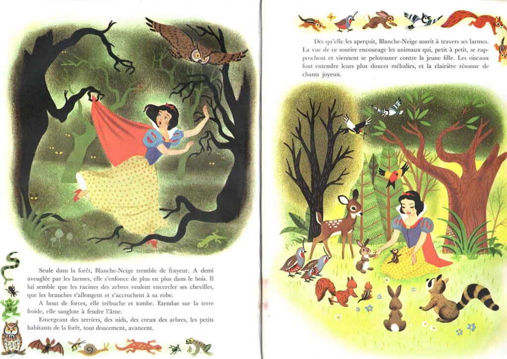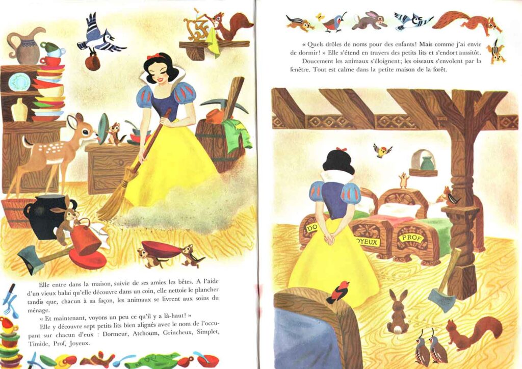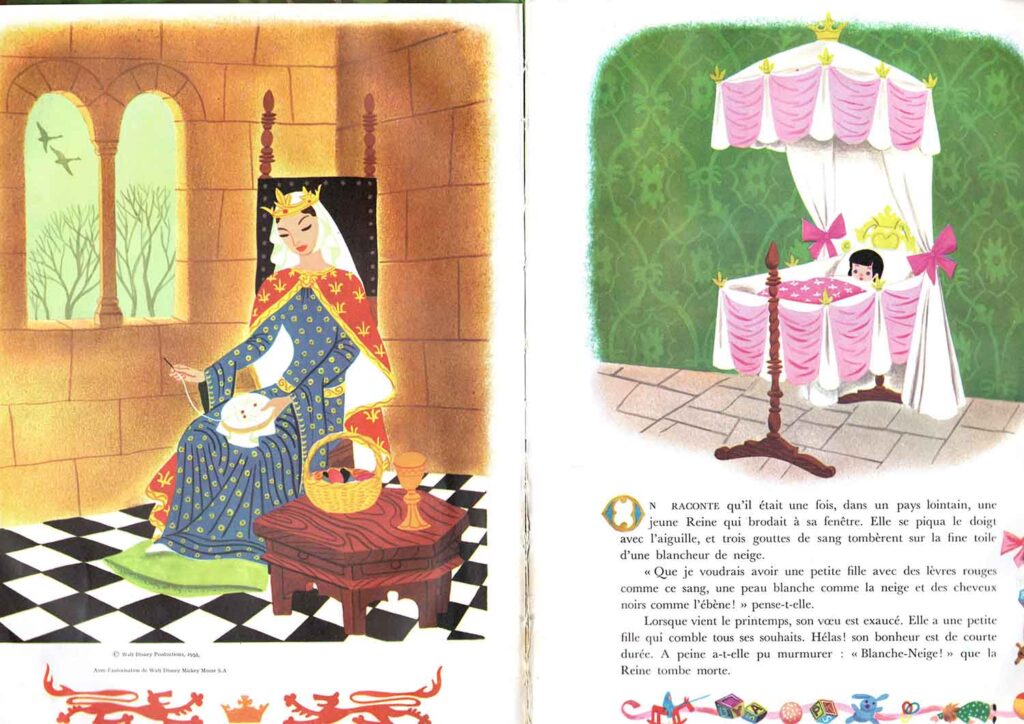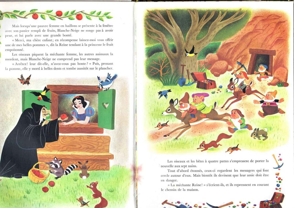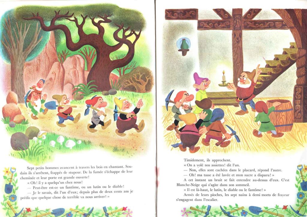 It’s in the original American book that we find the original authors: Jane Werner for the text and Campbell Grant for the illustrations. In fact, the book has been almost entirely copied: the cover omits the edges of the drawing on the American cover, but the pages simply replace the English text with the French one. In fact, the anonymous translator began his text with the letter O (“On raconte”), so as to be able to reuse the original lettering (“Once upon a time”). Unlike the film, the name “Snow White” is hyphenated in the title and throughout the rest of the text.