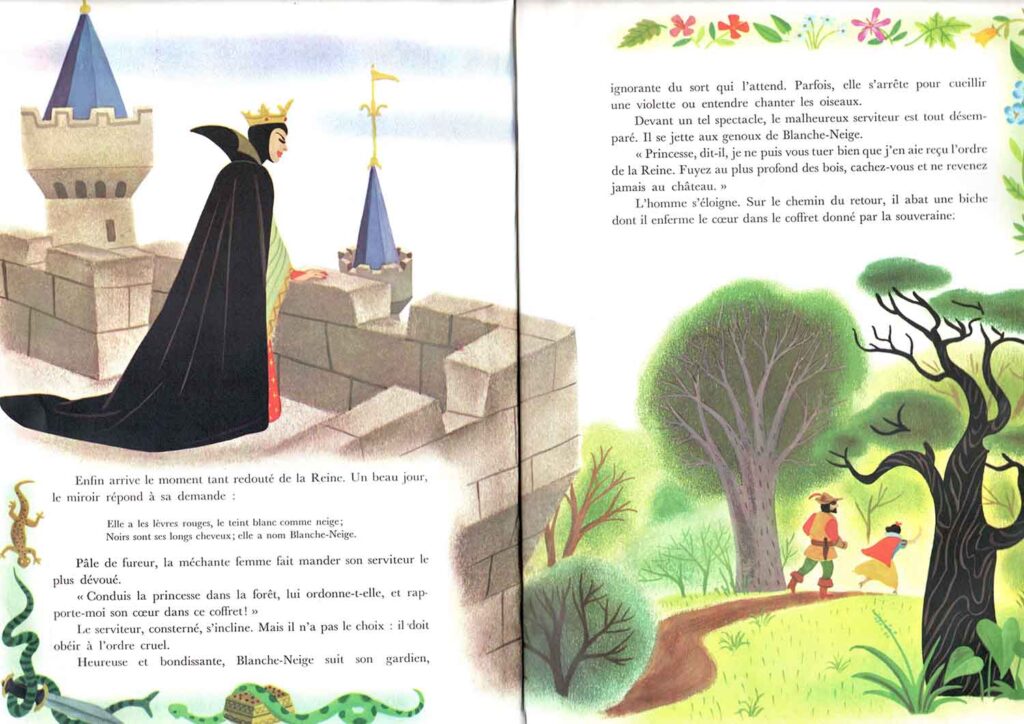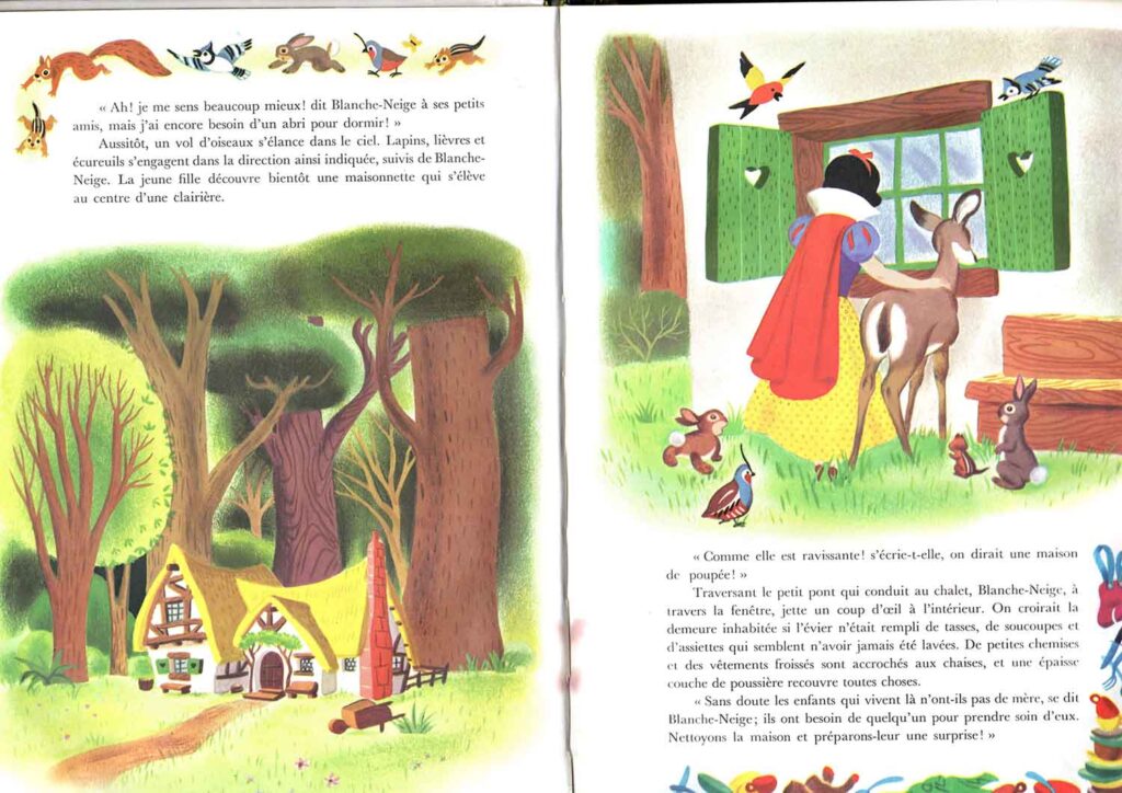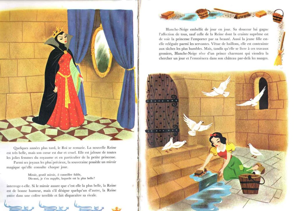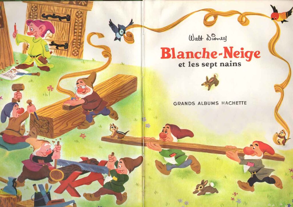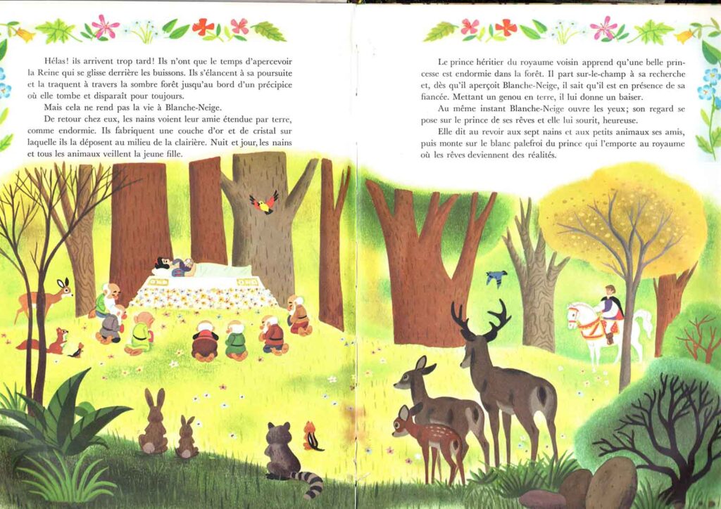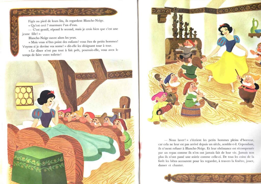 It’s in the original American book that we find the original authors: Jane Werner for the text and Campbell Grant for the illustrations. In fact, the book has been almost entirely copied: the cover omits the edges of the drawing on the American cover, but the pages simply replace the English text with the French one. In fact, the anonymous translator began his text with the letter O (“On raconte”), so as to be able to reuse the original lettering (“Once upon a time”). Unlike the film, the name “Snow White” is hyphenated in the title and throughout the rest of the text.