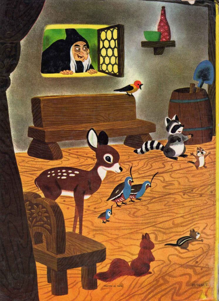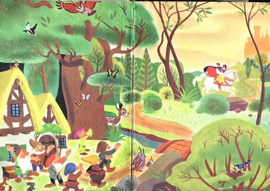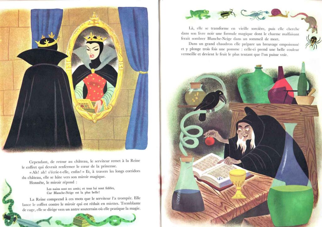 The style of the characters is subtly changed: Snow White wears a dress with red polka dots in 3 drawings, which disappear from the same dress on the following page. The Queen’s cape loses its ermine fringe and her collar becomes black, while her dress, originally a more subdued purple, shines here in a brilliant red adorned with small gold crosses, and her sleeves are emerald green.