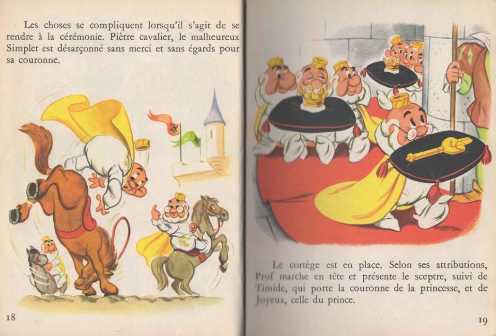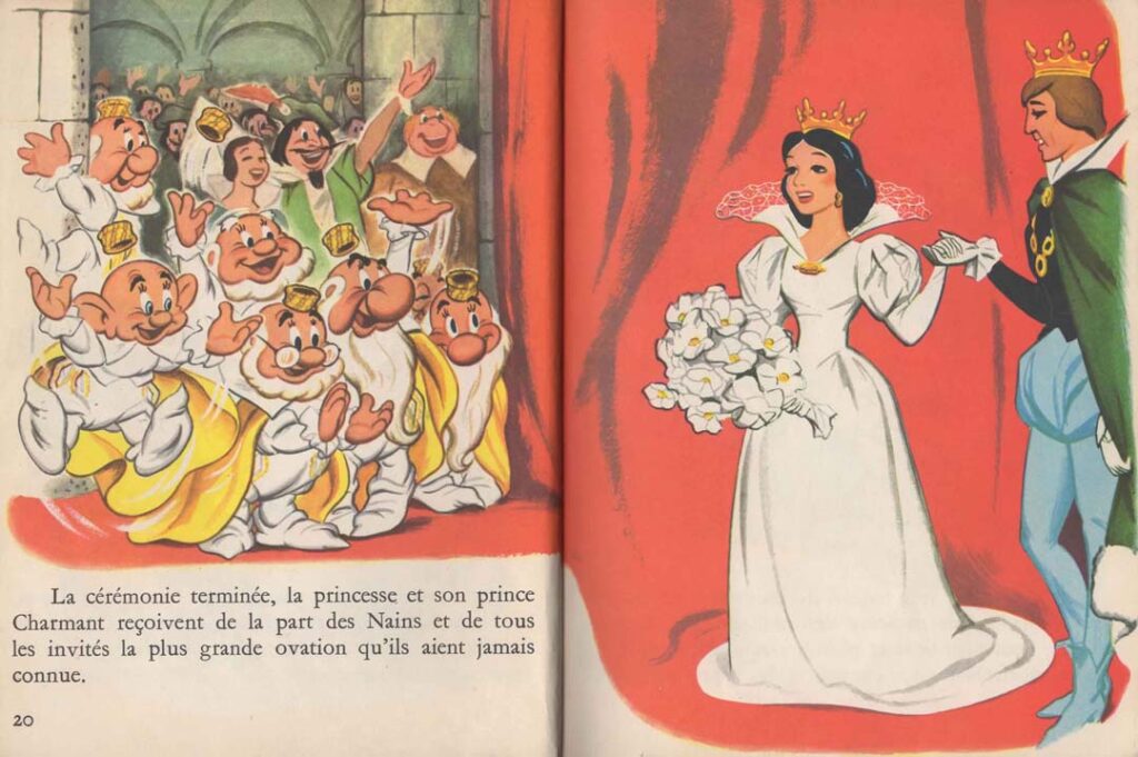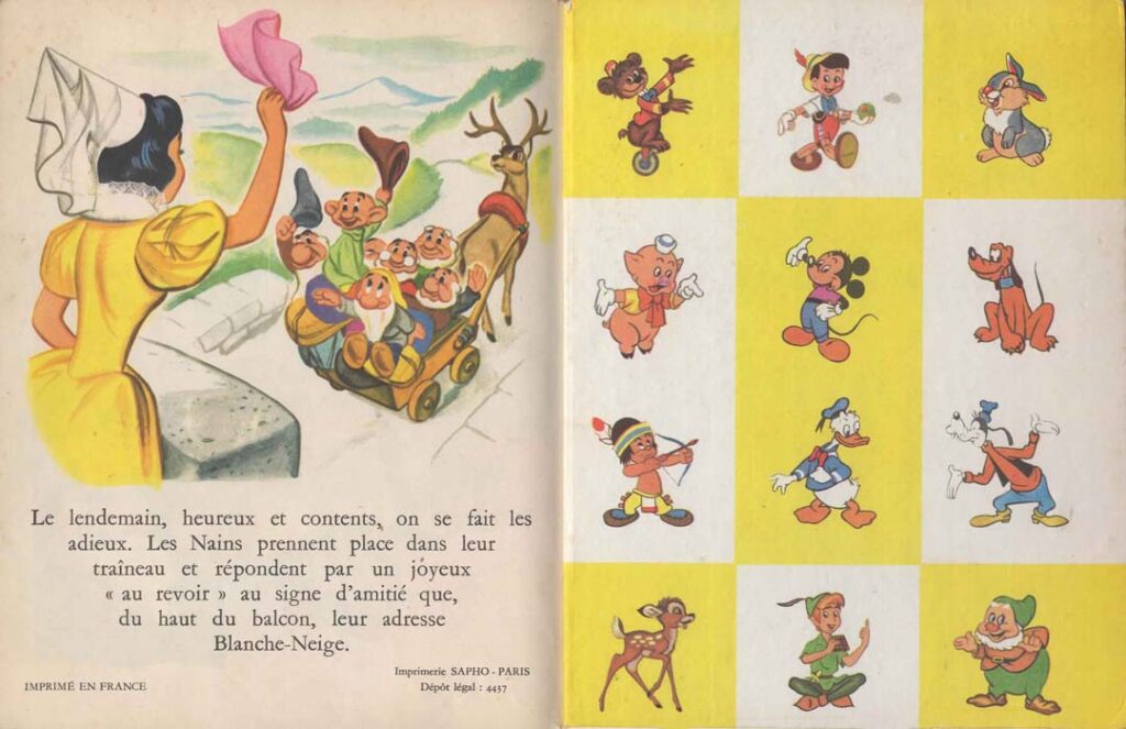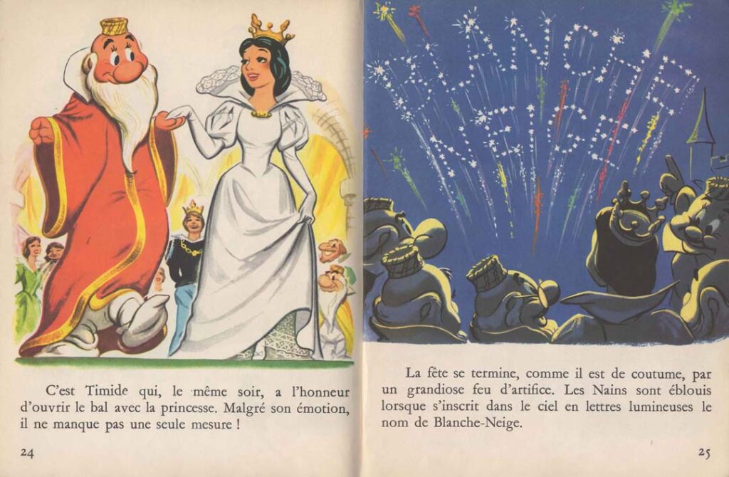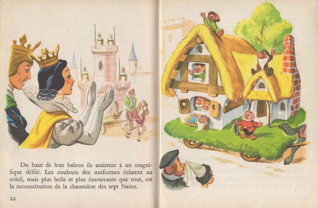 Snow White’s appearance on page 10 of the book, in a yellow dress with lace crown and collar, later served as the model for a popular rubber figurine.