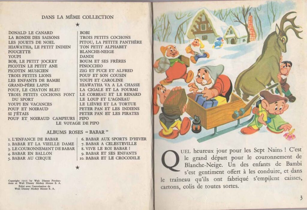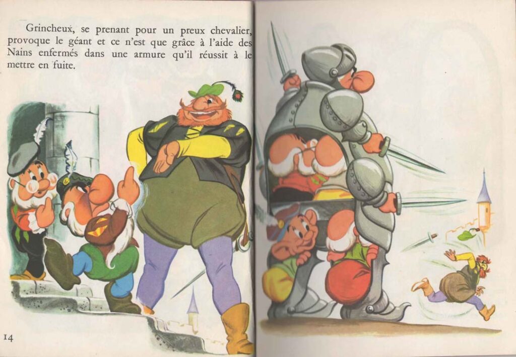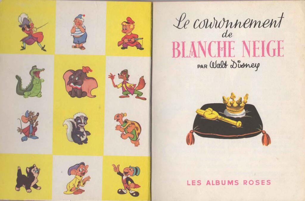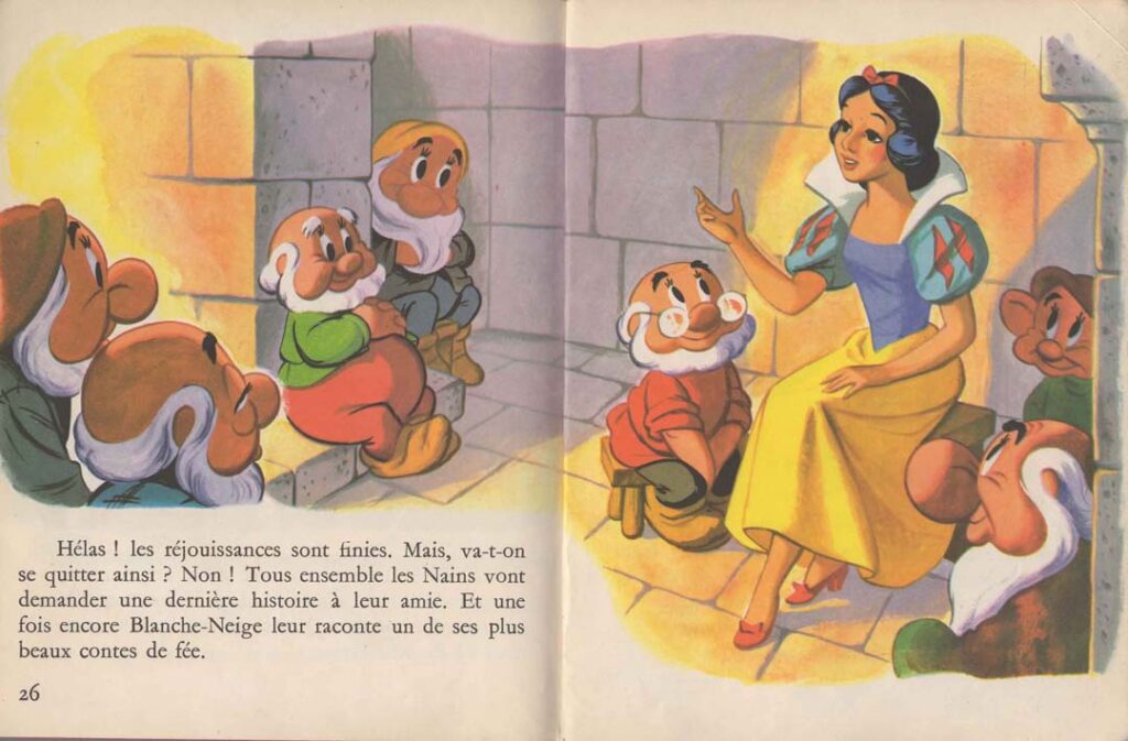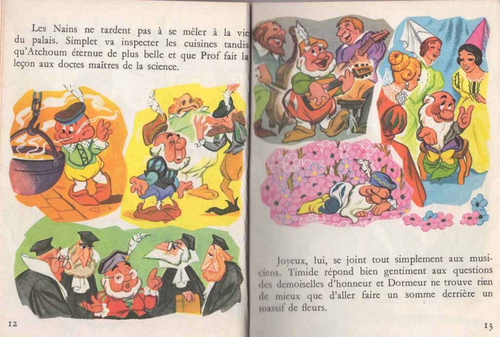 Snow White’s appearance on page 10 of the book, in a yellow dress with lace crown and collar, later served as the model for a popular rubber figurine.