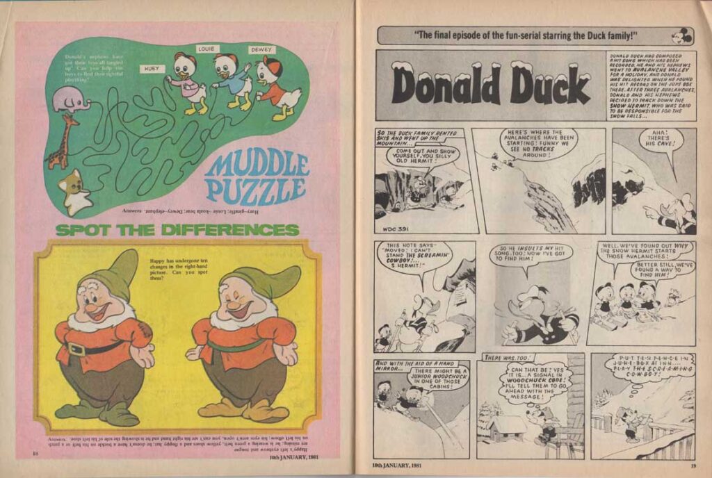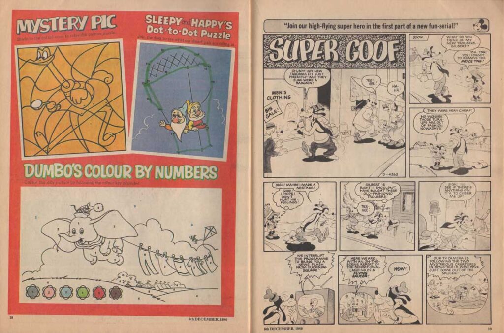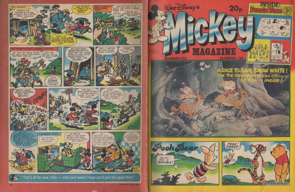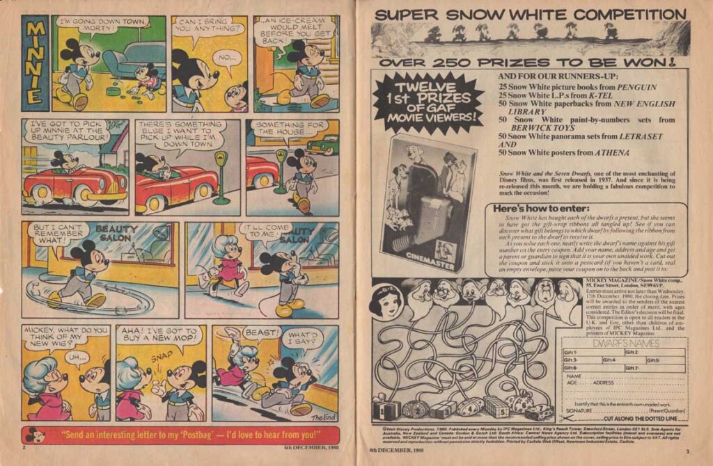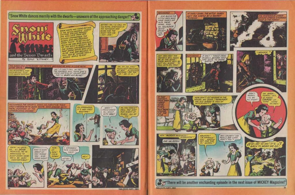 The magazine made ample use of the many characters of the Disney universe in their comic strips, and in the very last months of its existence, the magazine accompanied the 1980 British reissue of Snow White and the Seven Dwarfs. The film also inspires appearances by the characters in the magazine’s various regular sections such as “The Disney Film Show” that chronicles a Disney feature, games, contests, etc. The last issue was the 280th, only 8 weeks after the last Snow White strip was published.