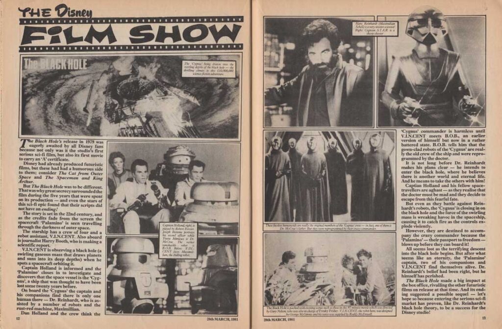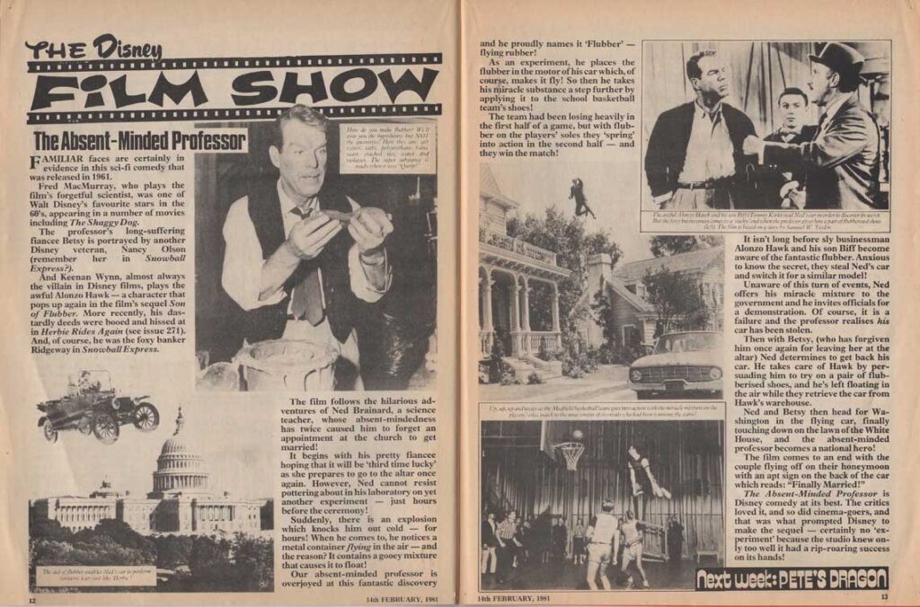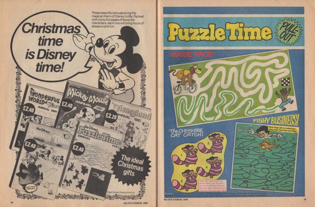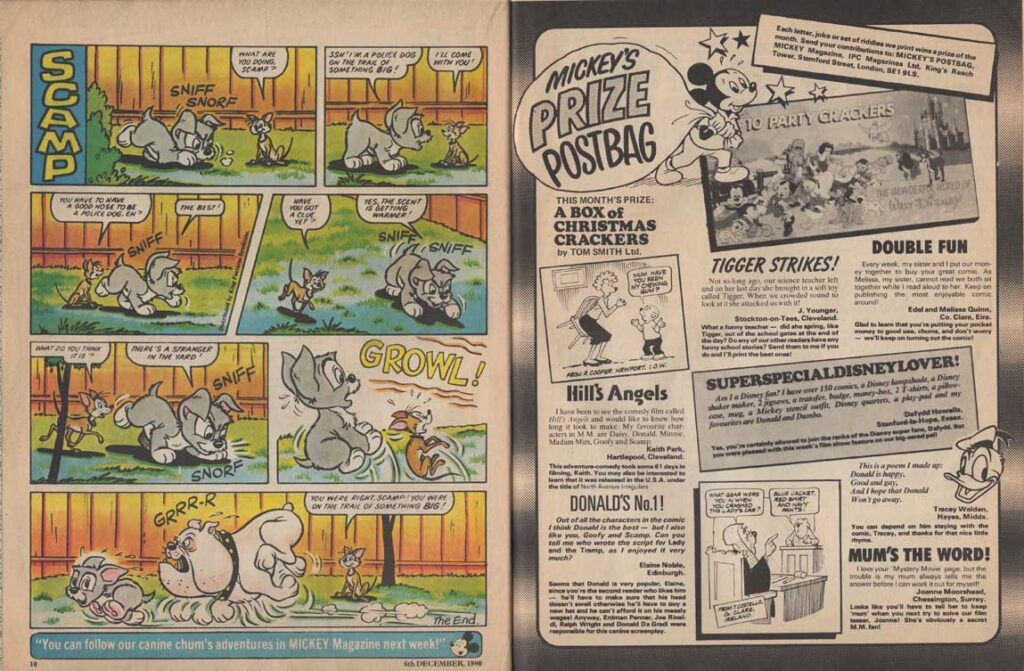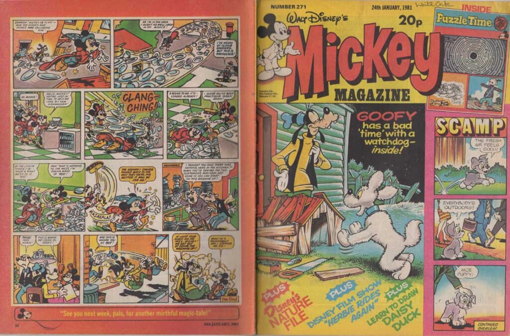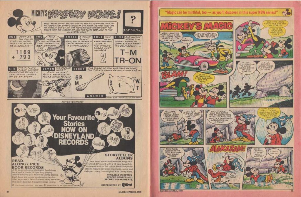 The magazine made ample use of the many characters of the Disney universe in their comic strips, and in the very last months of its existence, the magazine accompanied the 1980 British reissue of Snow White and the Seven Dwarfs. The film also inspires appearances by the characters in the magazine’s various regular sections such as “The Disney Film Show” that chronicles a Disney feature, games, contests, etc. The last issue was the 280th, only 8 weeks after the last Snow White strip was published.