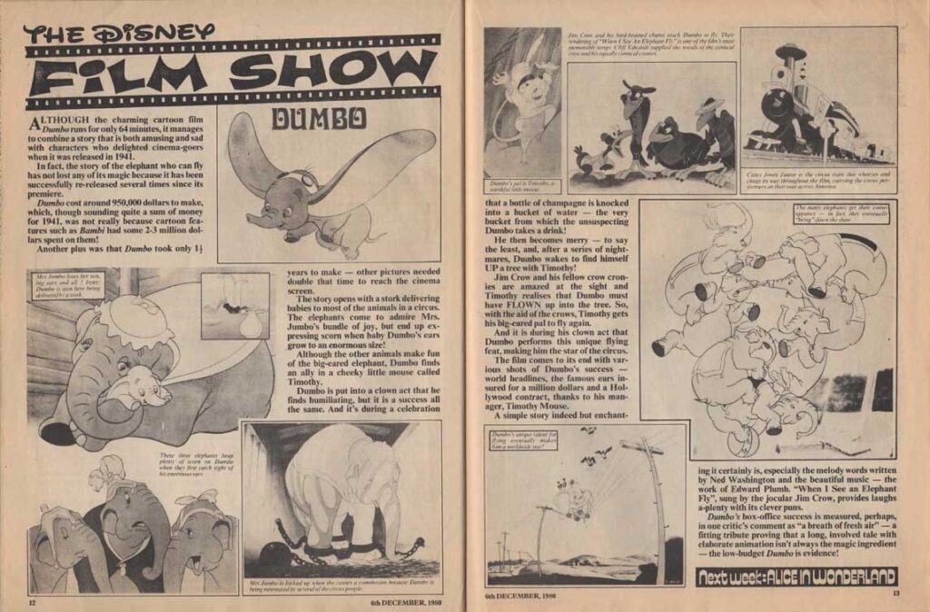Snow White and the seven dwarfs also appear in the royal ball puzzle and Sleepy and Happy’s dot-to-dot puzzle, An advertisement for K-tel read-along 7-inch book records and Storyteller albums. The Disney film show of the week is Dumbo.