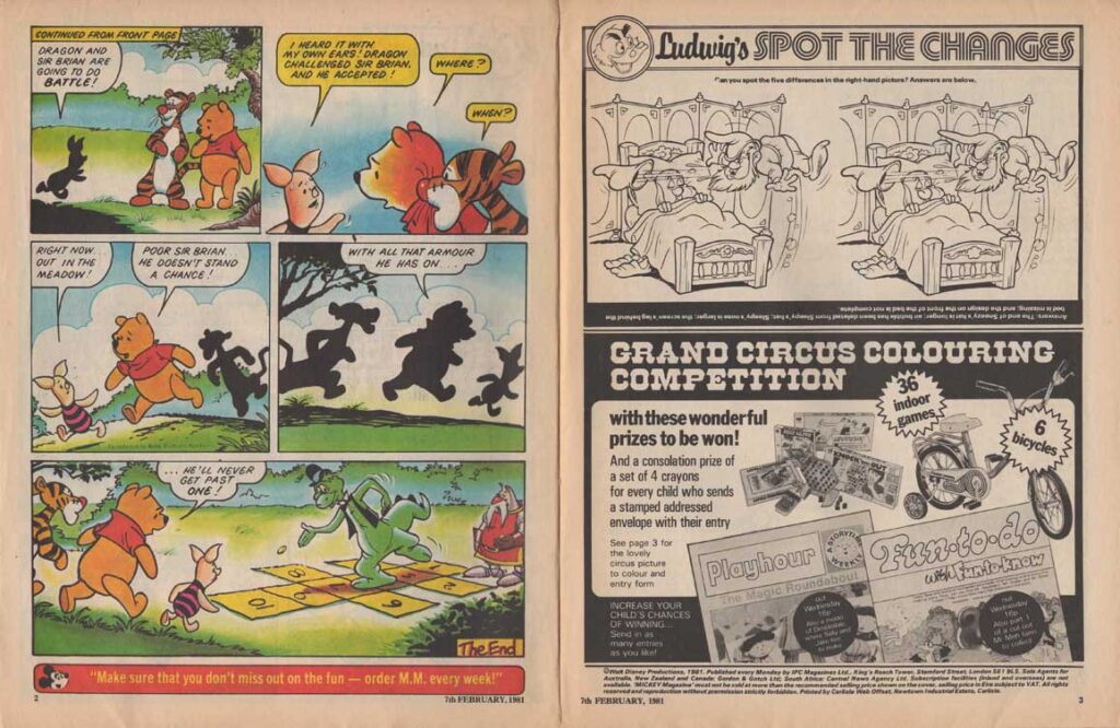 Indeed the serialisation comes to an end that week. Sleepy and Sneezy appear in “Ludwig’s spot the changes”. The Disney film show of the week is Peter Pan.