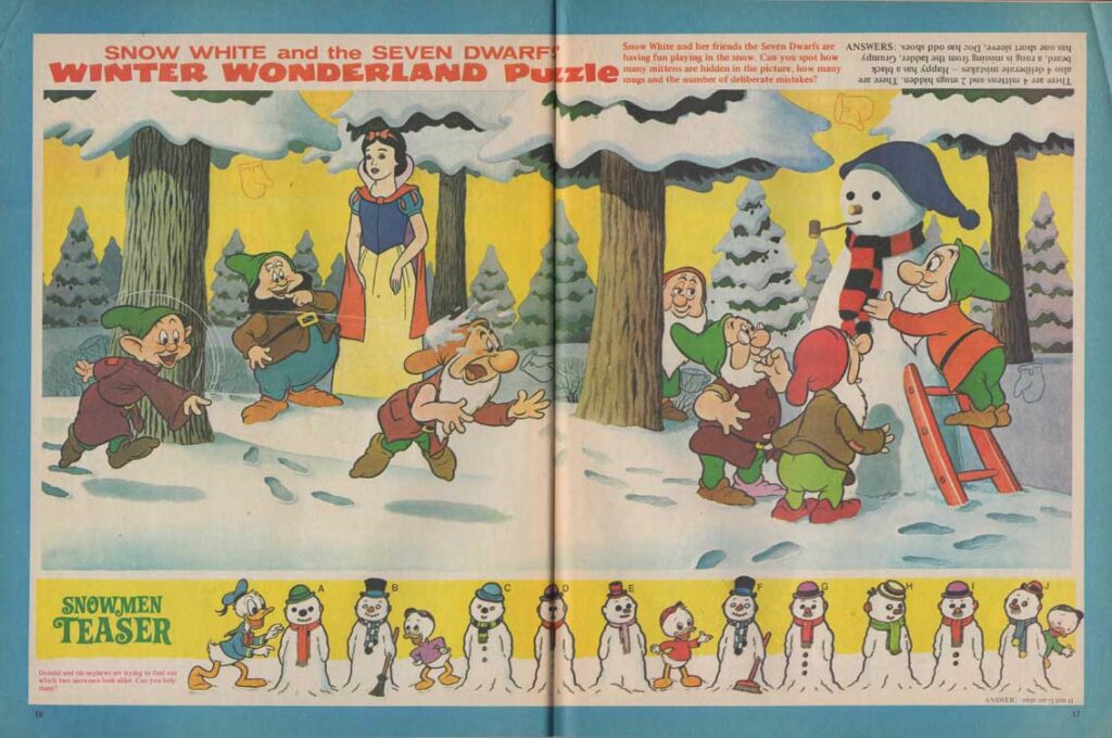 Even after the serialisation of the film ended, Snow White still appears in the pages of the magazine, as in this issue, where all the characters appear in “Name the characters word puzzle”.