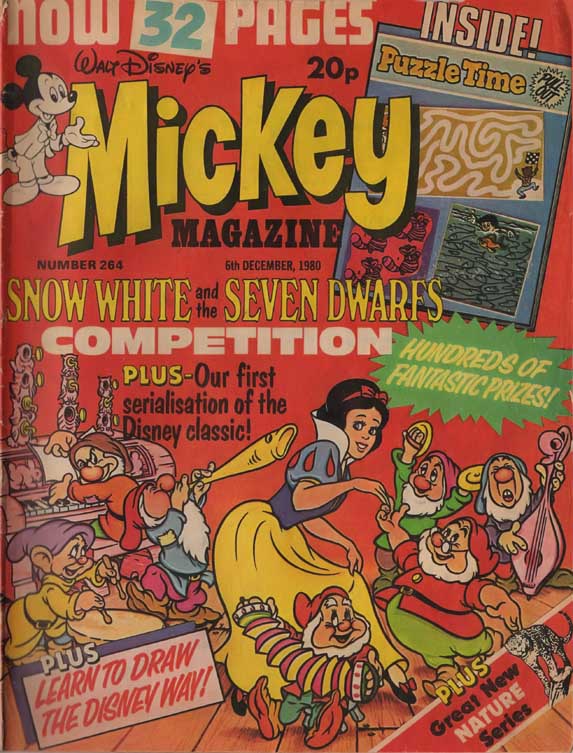 On the cover of this issue is a drawing of the scene where the dwarfs dance. It announces a Snow White and the Seven Dwarfs contest, and “Our first serialisation of the Disney classic!”