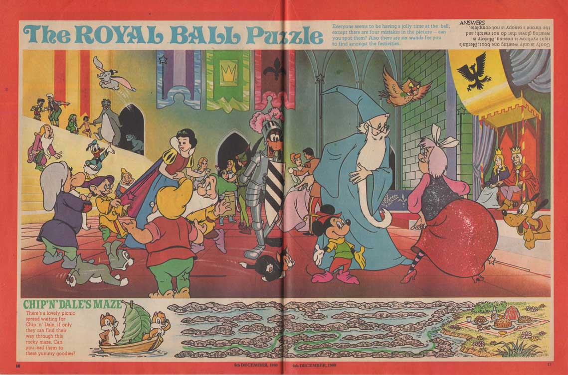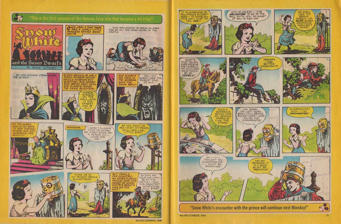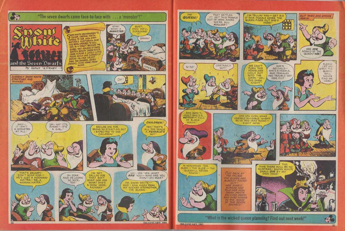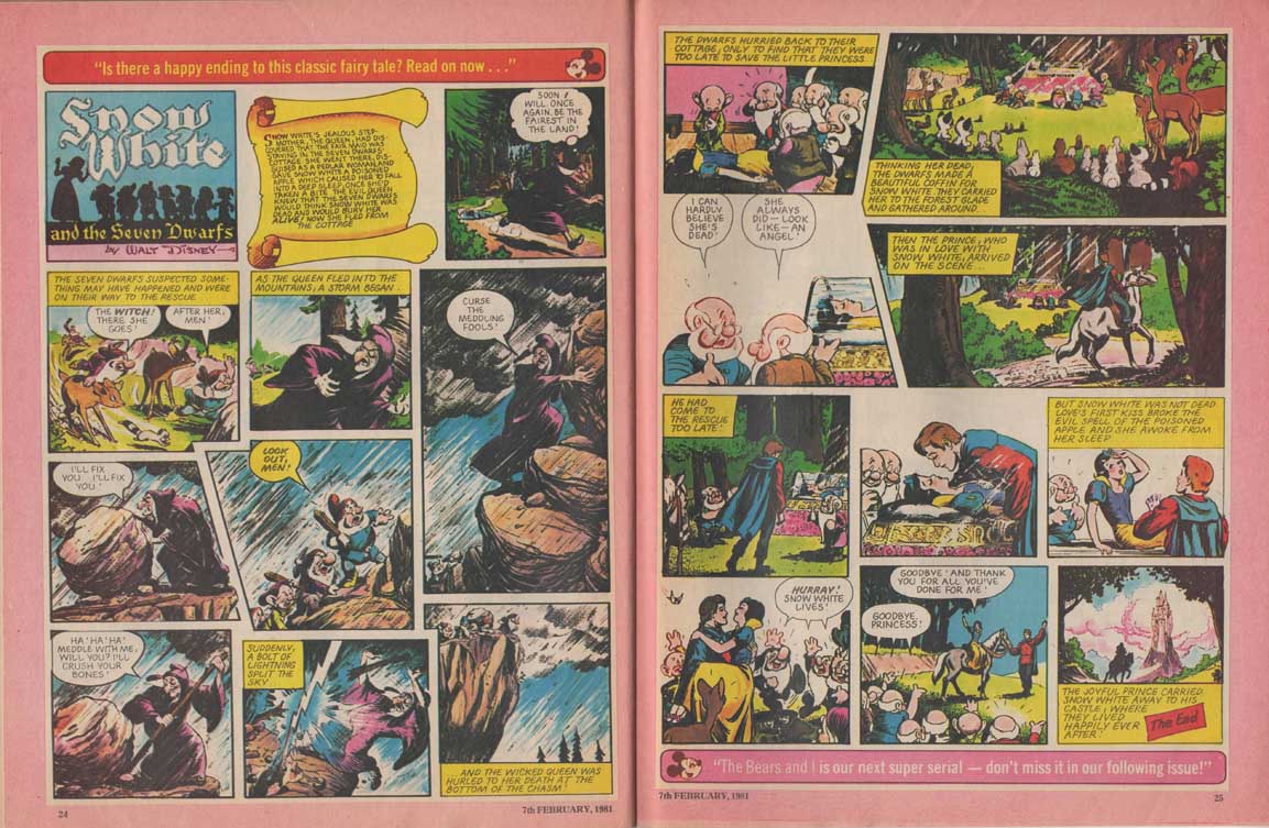 The magazine made ample use of the many characters of the Disney universe in their comic strips, and in the very last months of its existence, the magazine accompanied the 1980 British reissue of Snow White and the Seven Dwarfs. The film also inspires appearances by the characters in the magazine’s various regular sections such as “The Disney Film Show” that chronicles a Disney feature, games, contests, etc. The last issue was the 280th, only 8 weeks after the last Snow White strip was published.