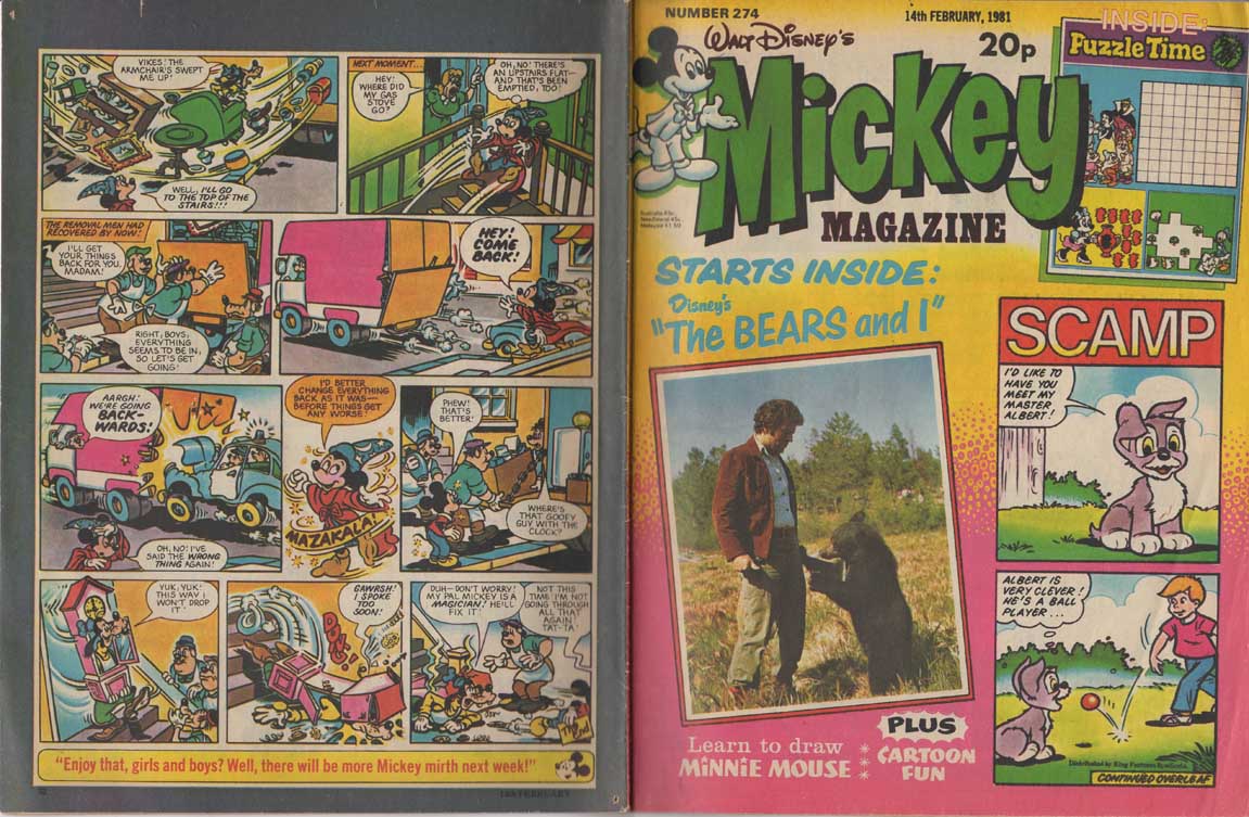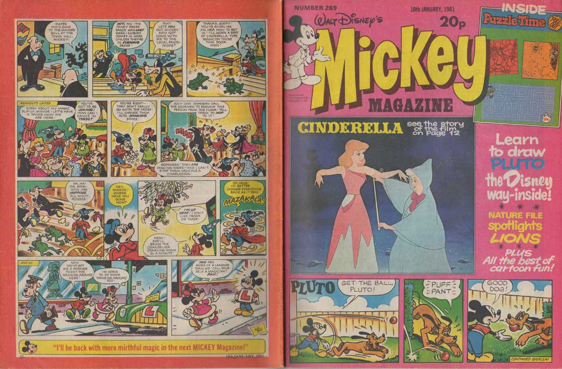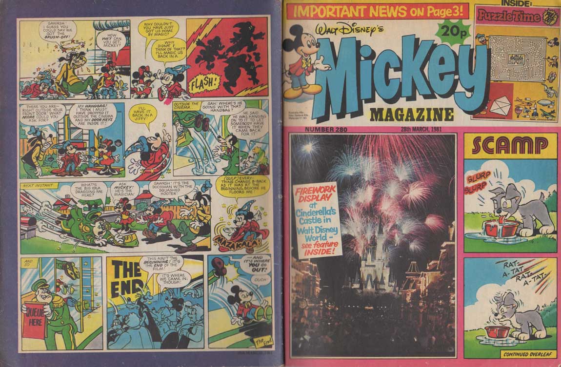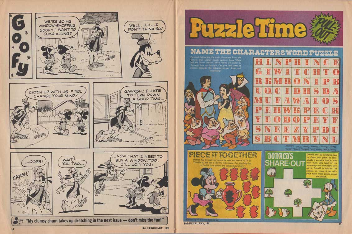 The magazine made ample use of the many characters of the Disney universe in their comic strips, and in the very last months of its existence, the magazine accompanied the 1980 British reissue of Snow White and the Seven Dwarfs. The film also inspires appearances by the characters in the magazine’s various regular sections such as “The Disney Film Show” that chronicles a Disney feature, games, contests, etc. The last issue was the 280th, only 8 weeks after the last Snow White strip was published.