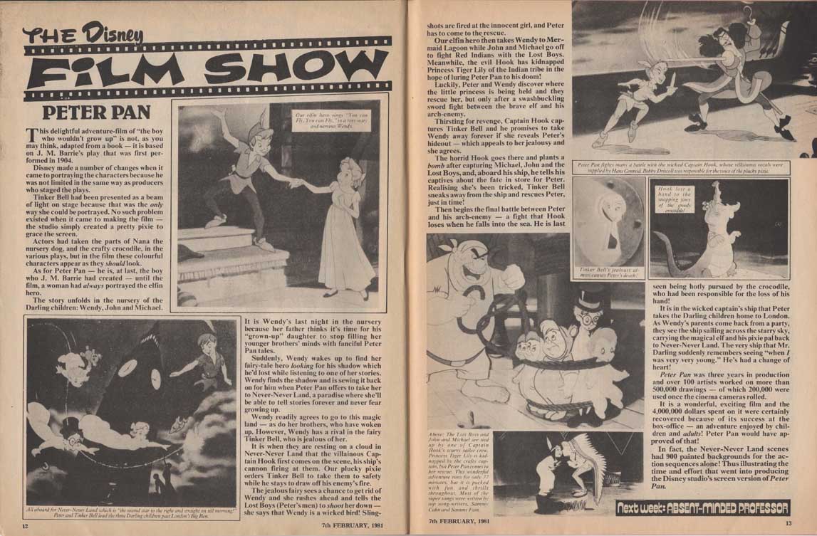 Indeed the serialisation comes to an end that week. Sleepy and Sneezy appear in “Ludwig’s spot the changes”. The Disney film show of the week is Peter Pan.