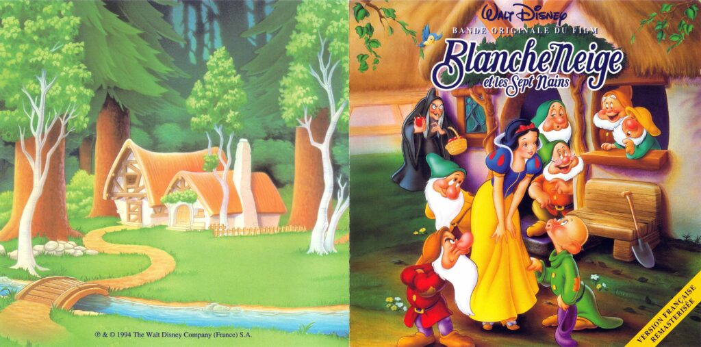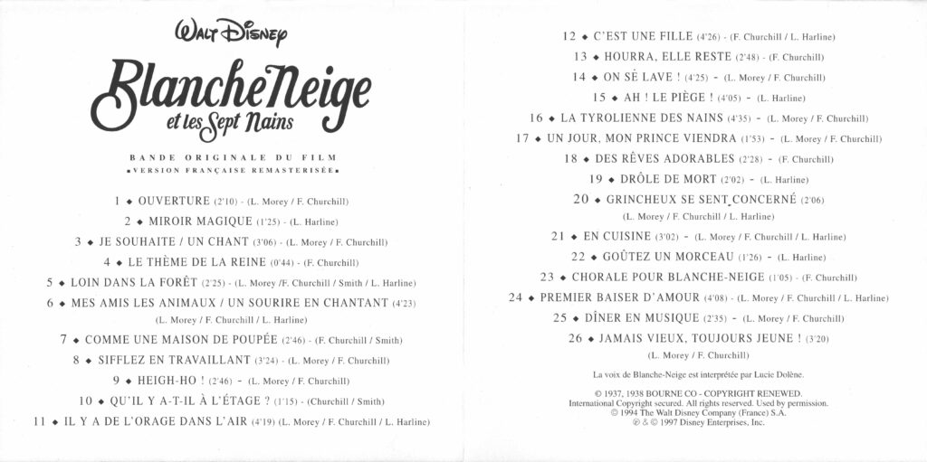The extensive liner notes of the American CD are also gone: the booklet here only lists the tracks and there is a brief mention that “Lucie Dolène is the voice of Snow White”. None of the other artists are listed. Also there seems to be a mixing error as track 9, “Heigh-Ho”, is listed as 2’46 min, when in reality, the track is only 1’52 min long since the music fades out in the middle of the song for some reason. However, track 24 is complete, unlike the version in English released a year earlier where a shorter finale was included.