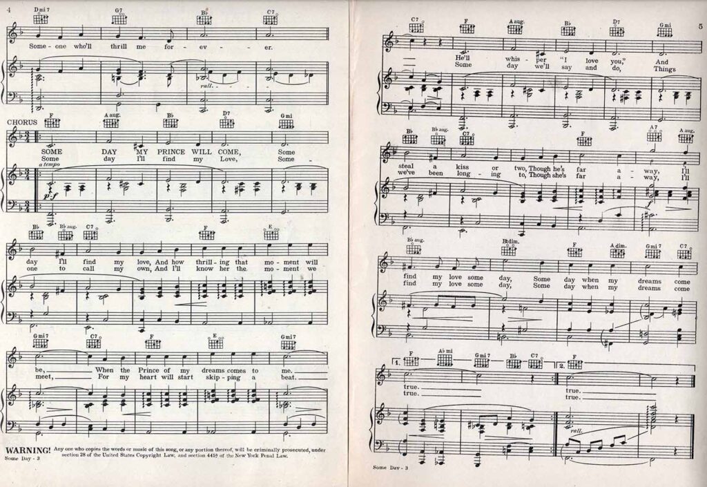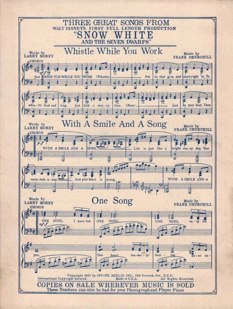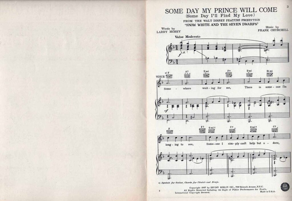 This is the sheet music for the song “Some Day My Prince Will Come” published by Irving Berlin Inc. in 1937 and composed by Frank Churchill for the music and Larry Morey for the lyrics. The American rights holders are mentioned on the cover: Irving Berlin Inc. Music Publishers 799 Seventh Avenue, New York, N.Y., to whom Walt Disney has granted the rights to exploit the film’s music. This is the sixth song in the film after “With a Smile and a Song” in the score numbering. The back cover encourages the purchase of “Whistle While You Work”, “With a Smile and a Song” and “One Song”, offering the first notes of each song.