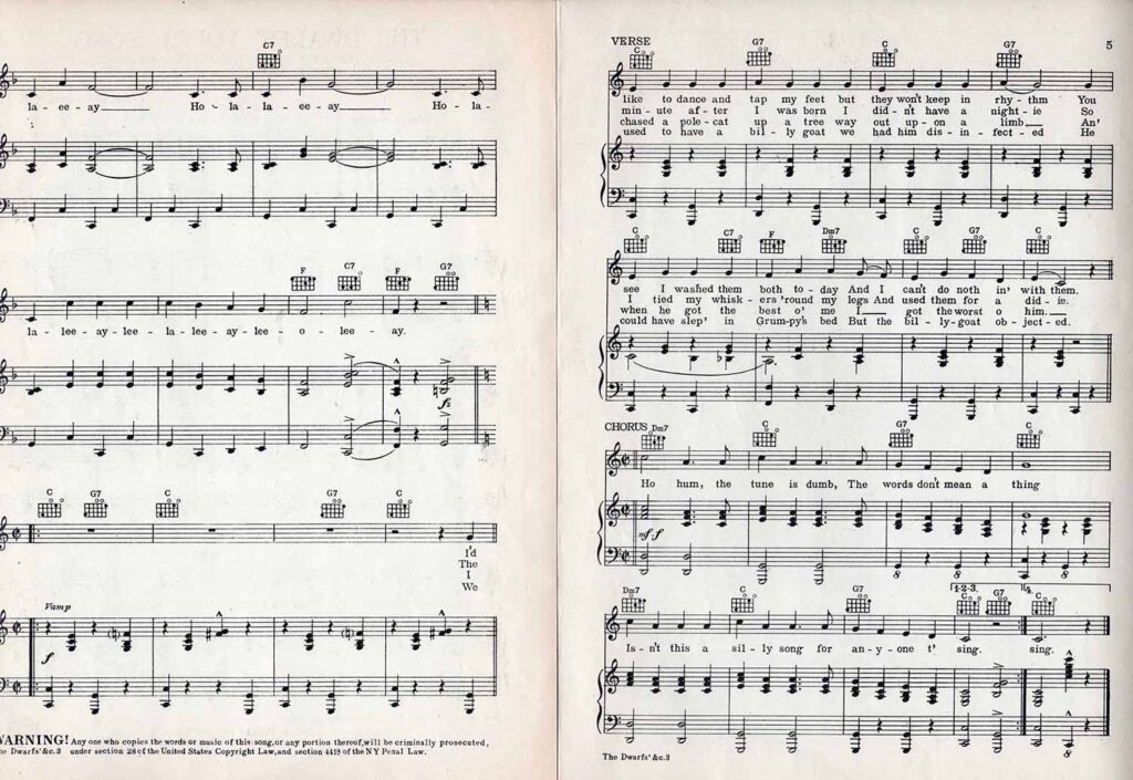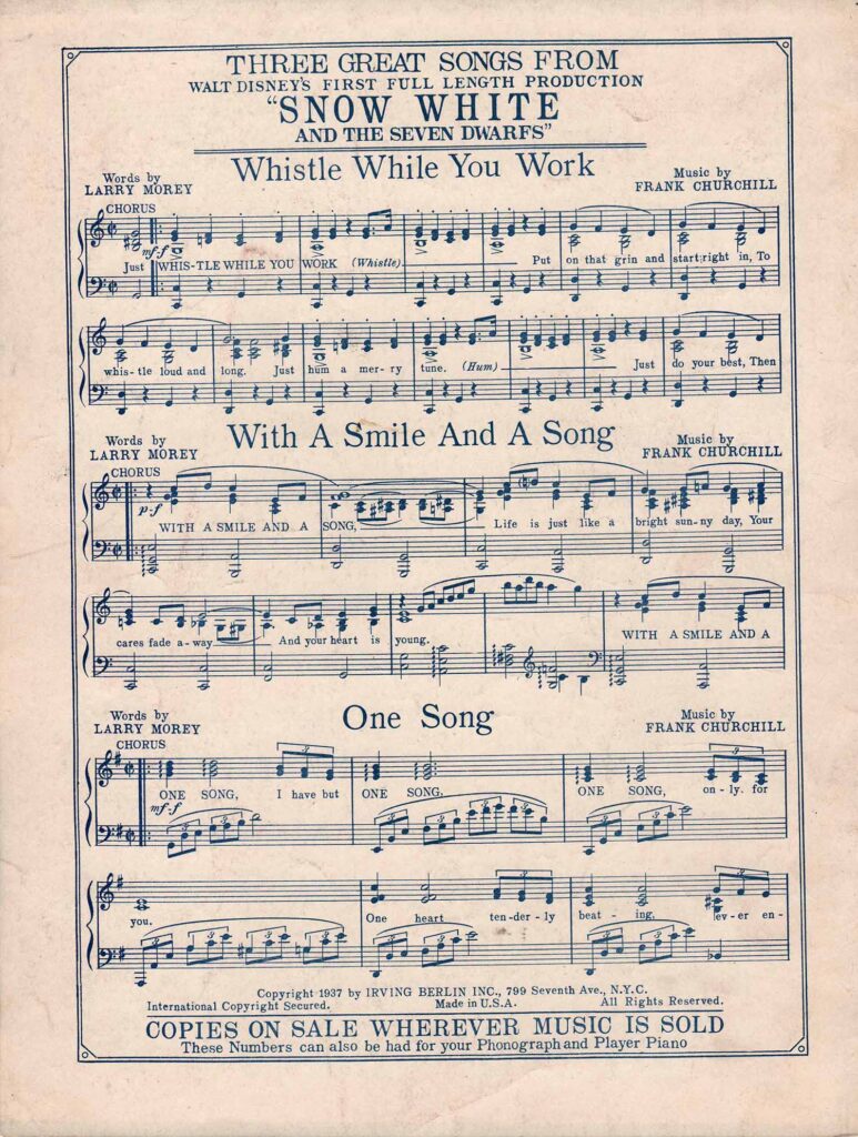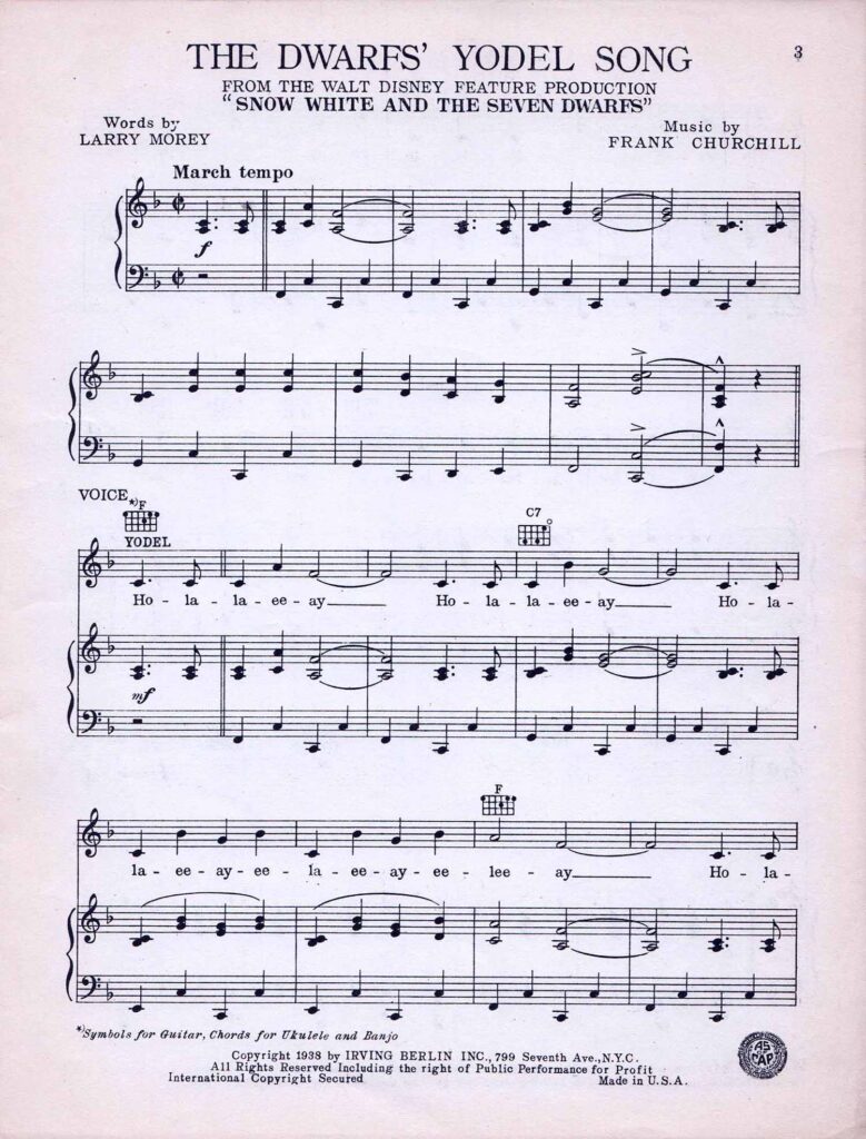 This sheet is the score of “The Dwarf’s Yodel Song” published by Irving Berlin Inc. in 1937, with music by Frank Churchill and lyrics by Larry Morey. The American rights holders are mentioned on the cover: Irving Berlin Inc. Music Publishers 799 Seventh Avenue, New York, N.Y., to whom Walt Disney has granted the rights to exploit the film’s music. It is the fourth song in the film after “Whistle While You Work” in the numbering of the scores. The back cover encourages the purchase of “Some Day My Prince Will Come”, “With a Smile and a Song” and “One Song”, offering the first notes of each song.