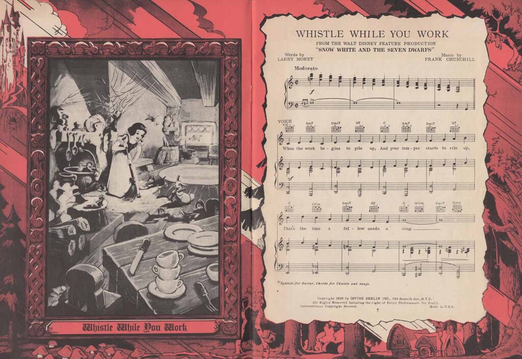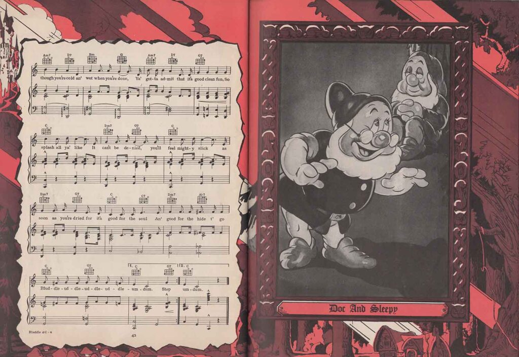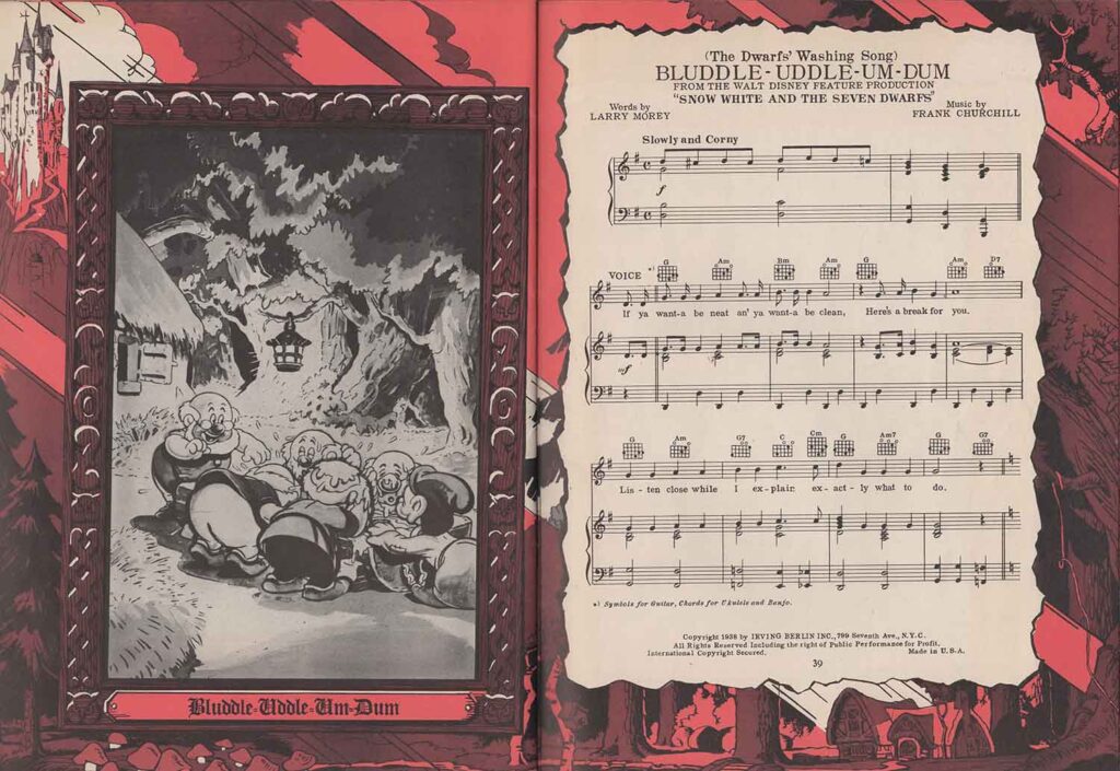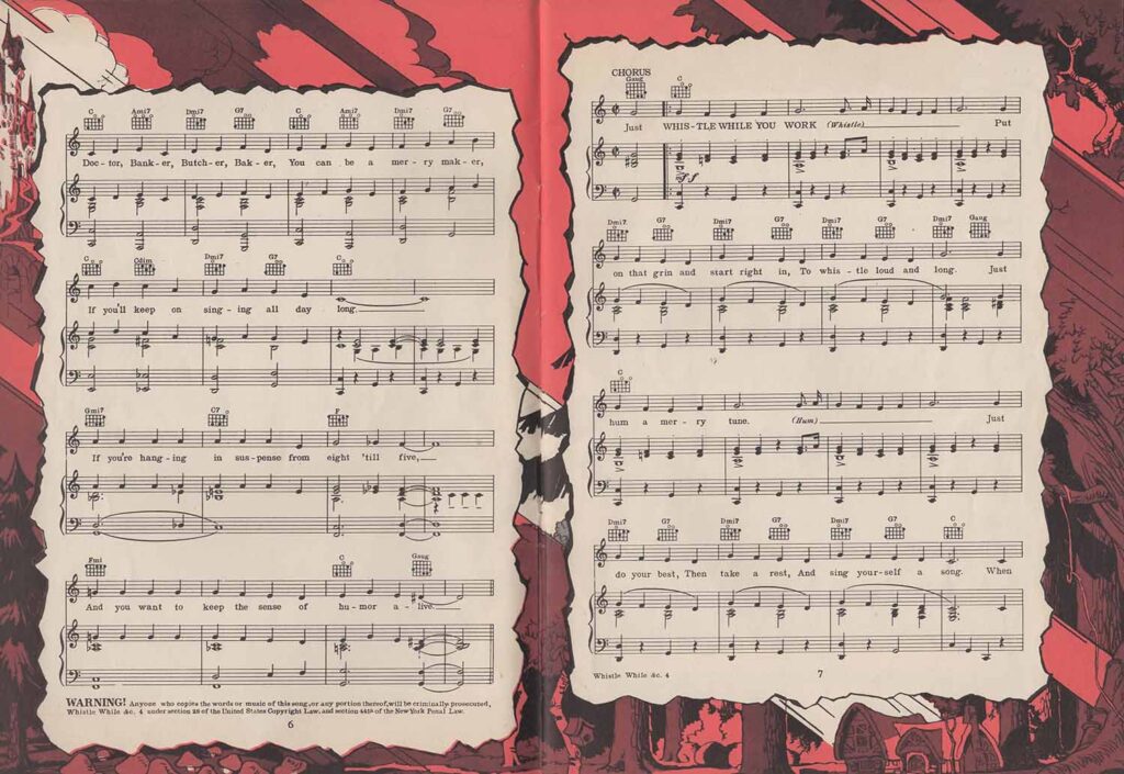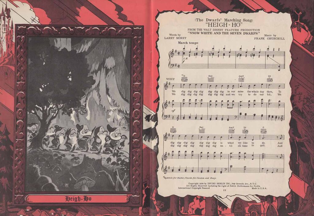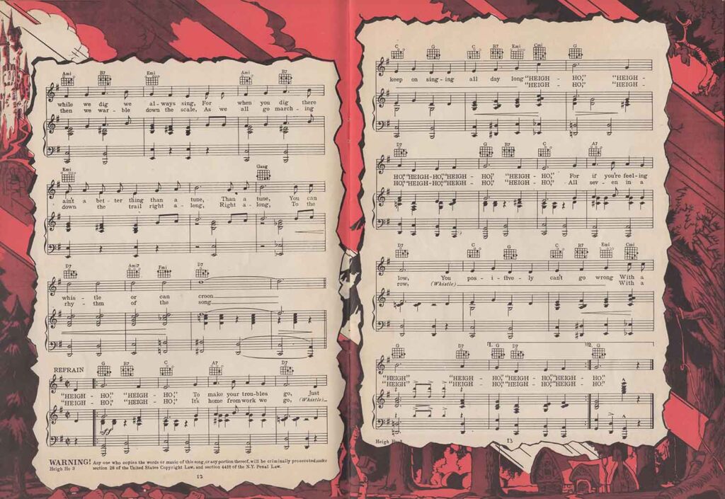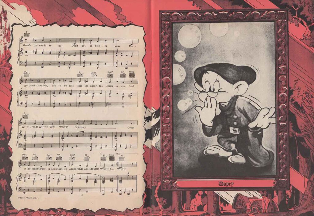 Note the inclusion of the song “Dig Dig Dig” in the score for “Heigh-Ho”, but the addition of the song “Snow White”, which is not heard in the film. It’s easy to see from the scores that none of the songs here are exactly the same as those heard in the film. In fact, the lyrics are either completely different (“Whistle While You Work”), or new introductions or elements not found in the film have been added, all in order to offer versions more suitable for use on record, or in dance halls.
