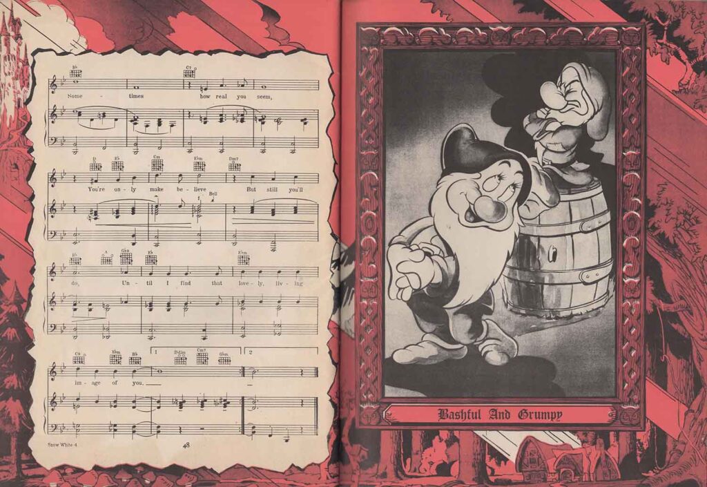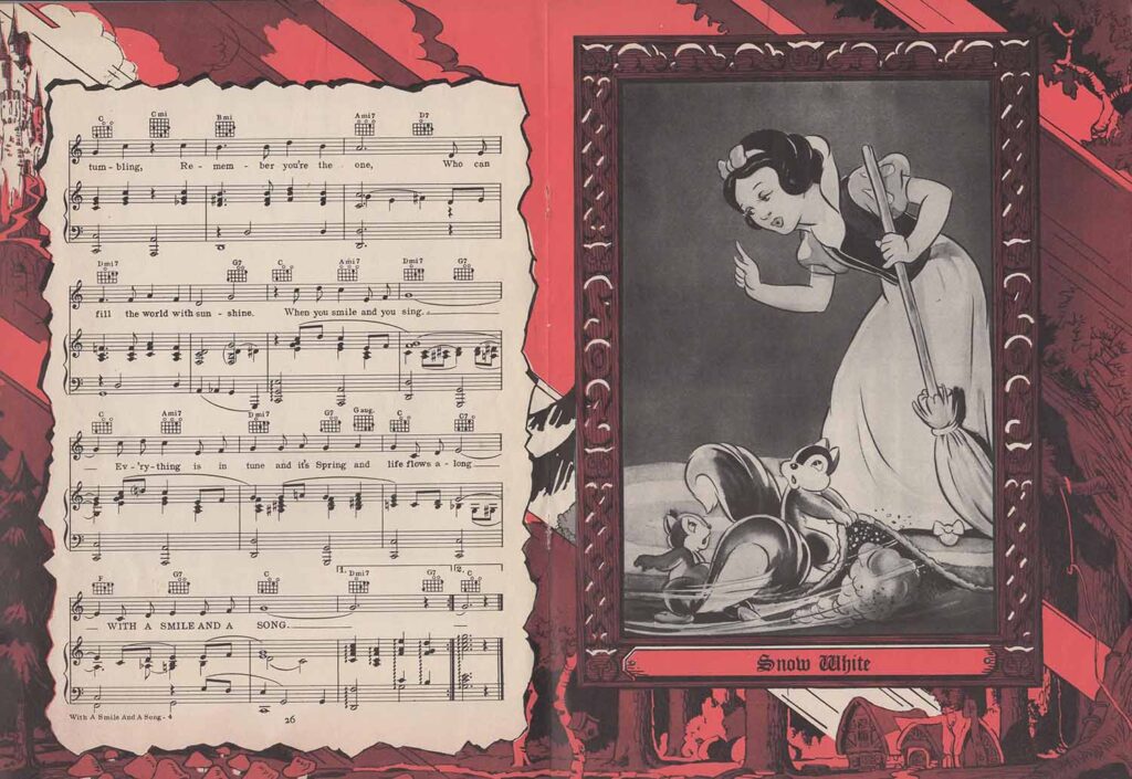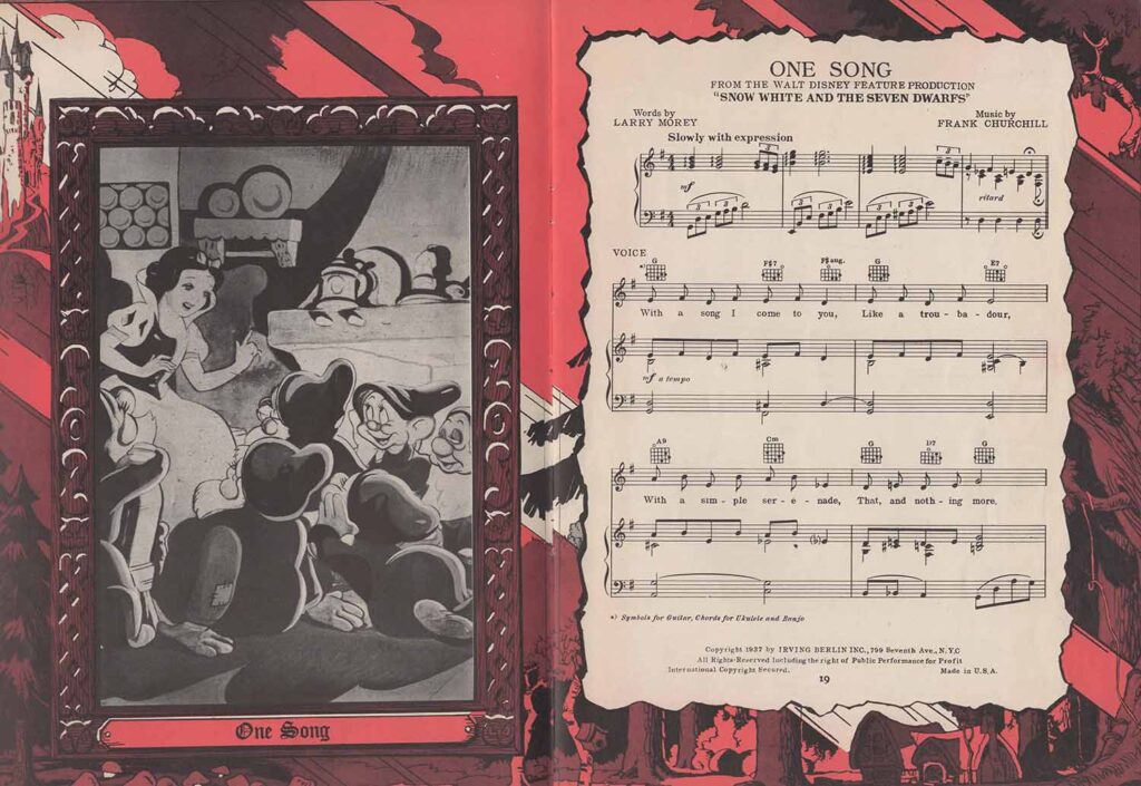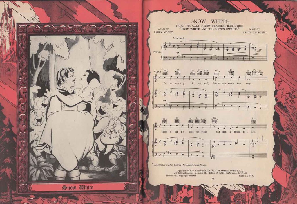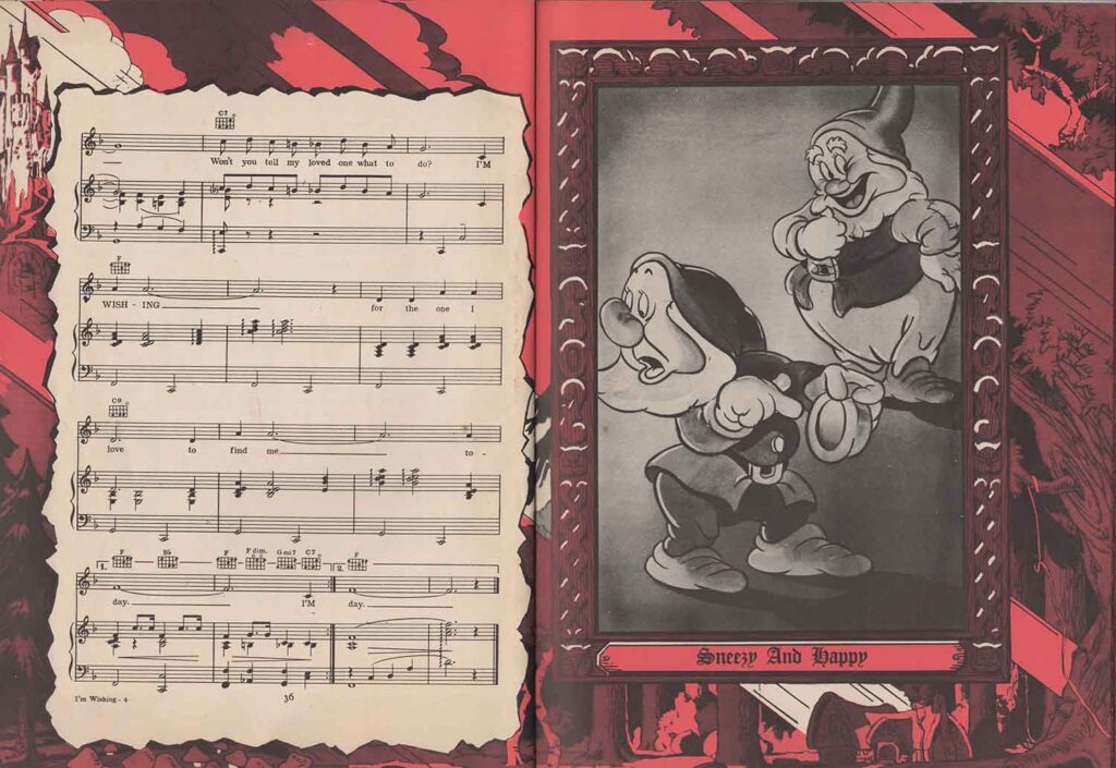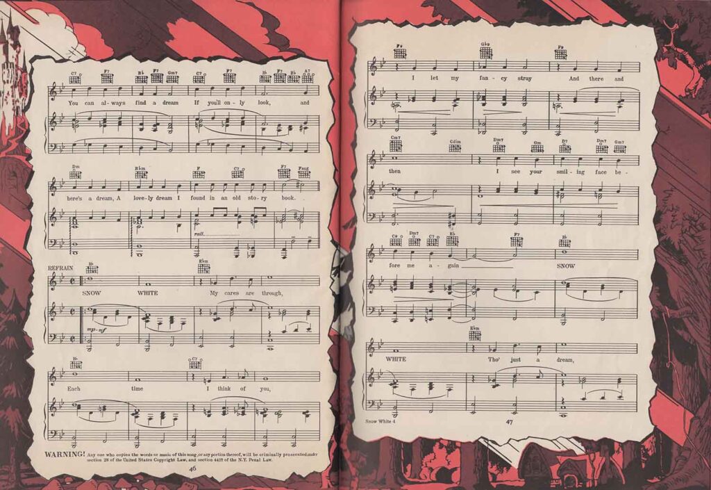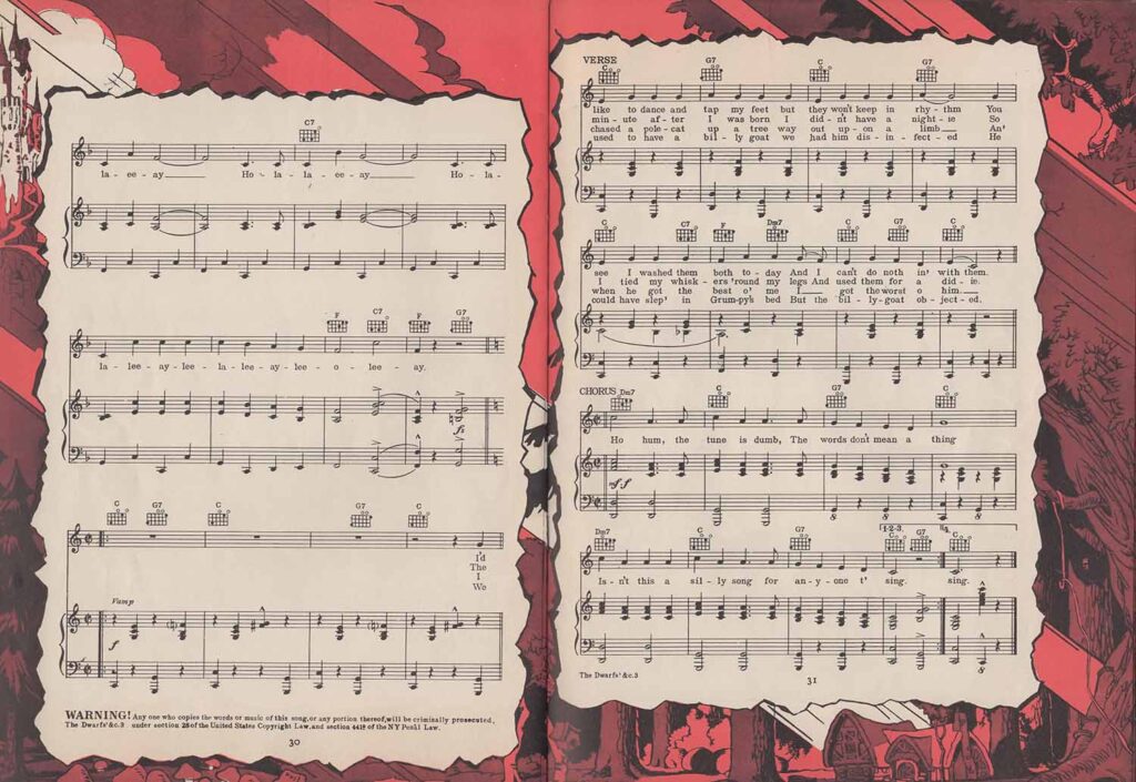 Note the inclusion of the song “Dig Dig Dig” in the score for “Heigh-Ho”, but the addition of the song “Snow White”, which is not heard in the film. It’s easy to see from the scores that none of the songs here are exactly the same as those heard in the film. In fact, the lyrics are either completely different (“Whistle While You Work”), or new introductions or elements not found in the film have been added, all in order to offer versions more suitable for use on record, or in dance halls.