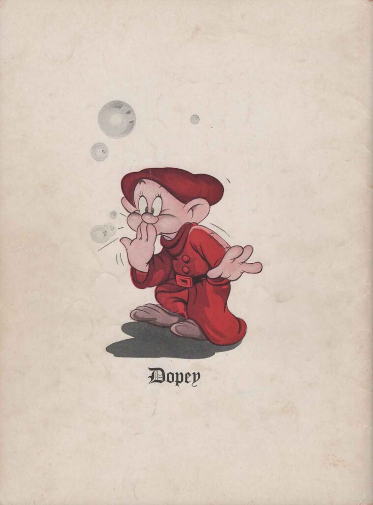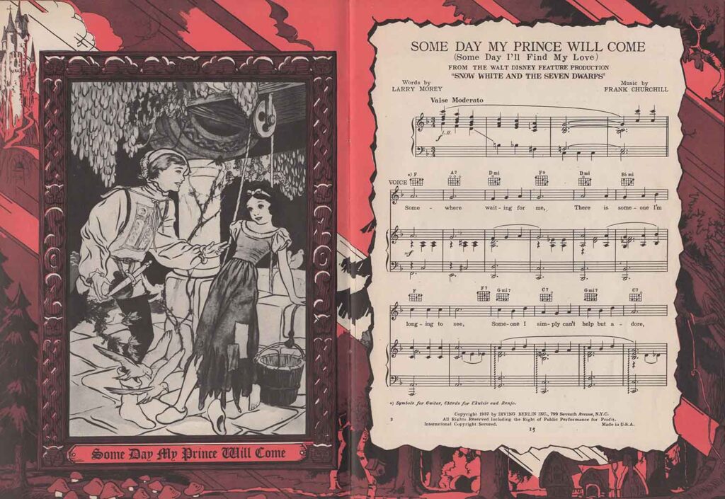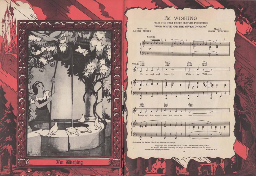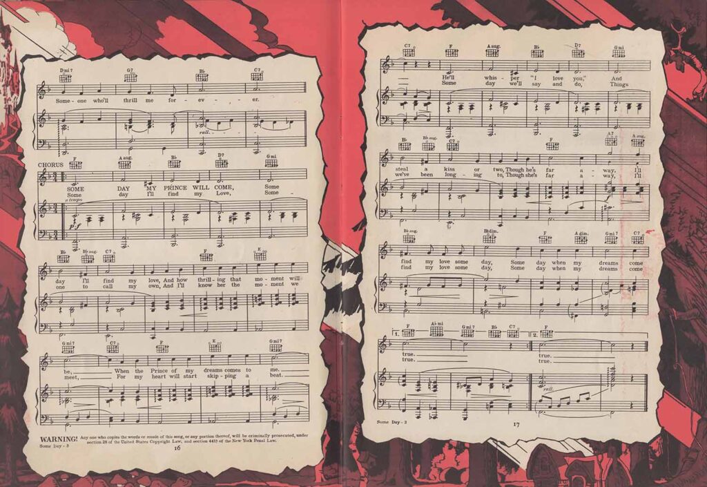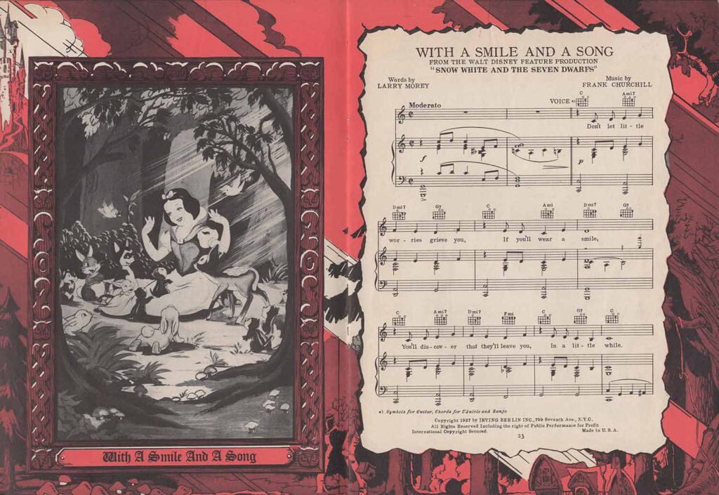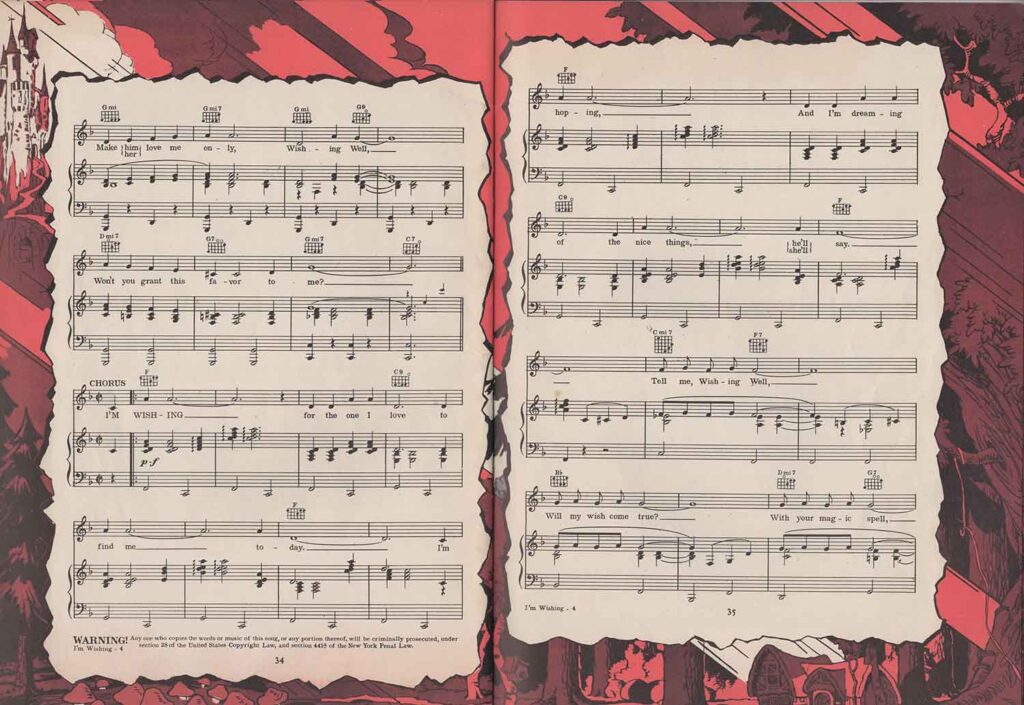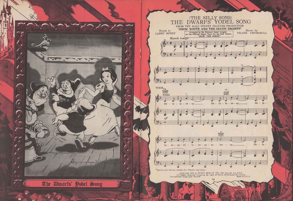 Note the inclusion of the song “Dig Dig Dig” in the score for “Heigh-Ho”, but the addition of the song “Snow White”, which is not heard in the film. It’s easy to see from the scores that none of the songs here are exactly the same as those heard in the film. In fact, the lyrics are either completely different (“Whistle While You Work”), or new introductions or elements not found in the film have been added, all in order to offer versions more suitable for use on record, or in dance halls.