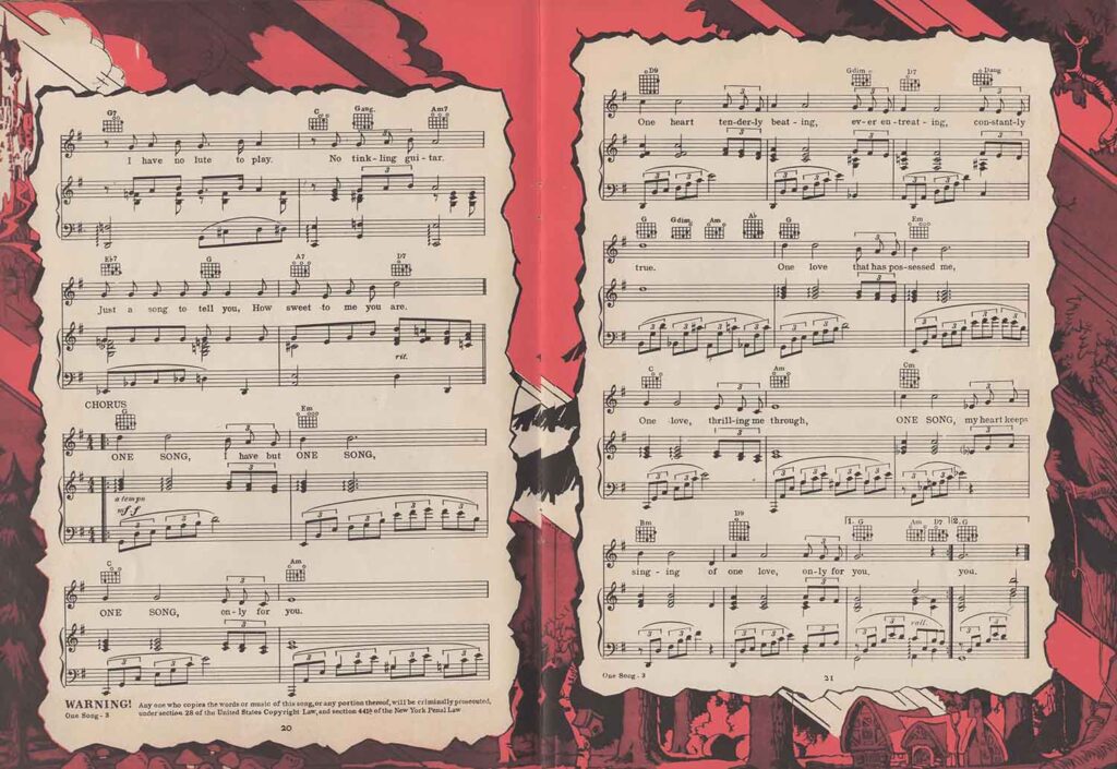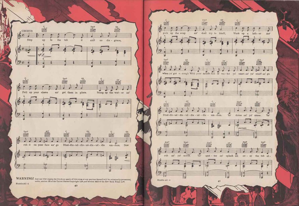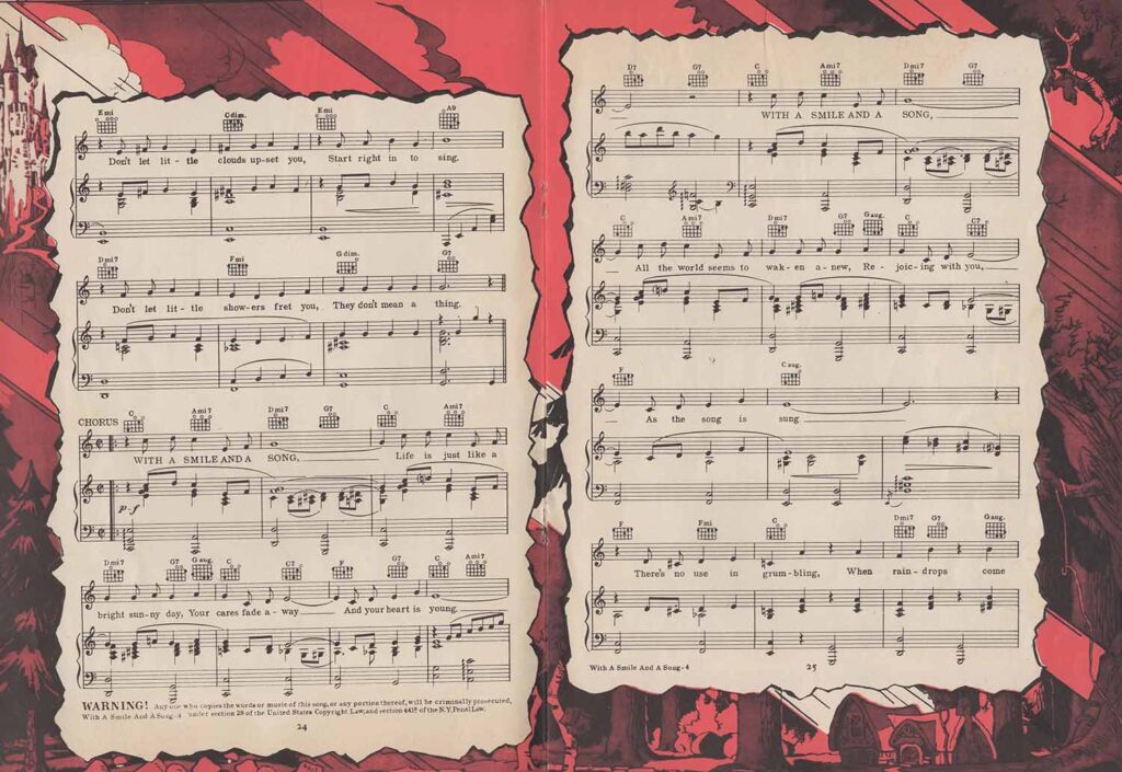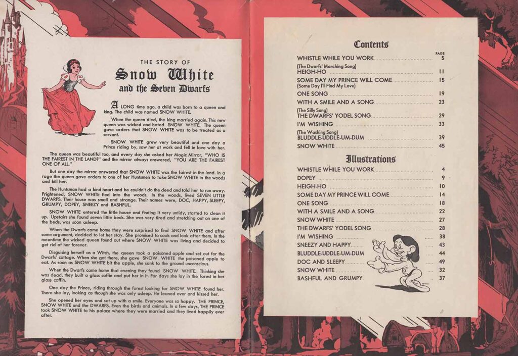 The American rights holders are mentioned on the cover and on several pages: Copyright 1937 Irving Berlin Inc. 799 Seventh Avenue, N.Y.C., to whom Walt Disney assigned the rights to exploit the film’s music. This 52-page compendium is priced at 0.75 and each page features a frame with illustrations in red. There is a pagination error in the table of contents, which refers not only to the songs but also to the illustrations. However, pages 32 and 37 are inexplicably placed at the end of the list, shifting all subsequent illustration pages. These illustrations are in black and white and appear to be drawings by Tom Wood.