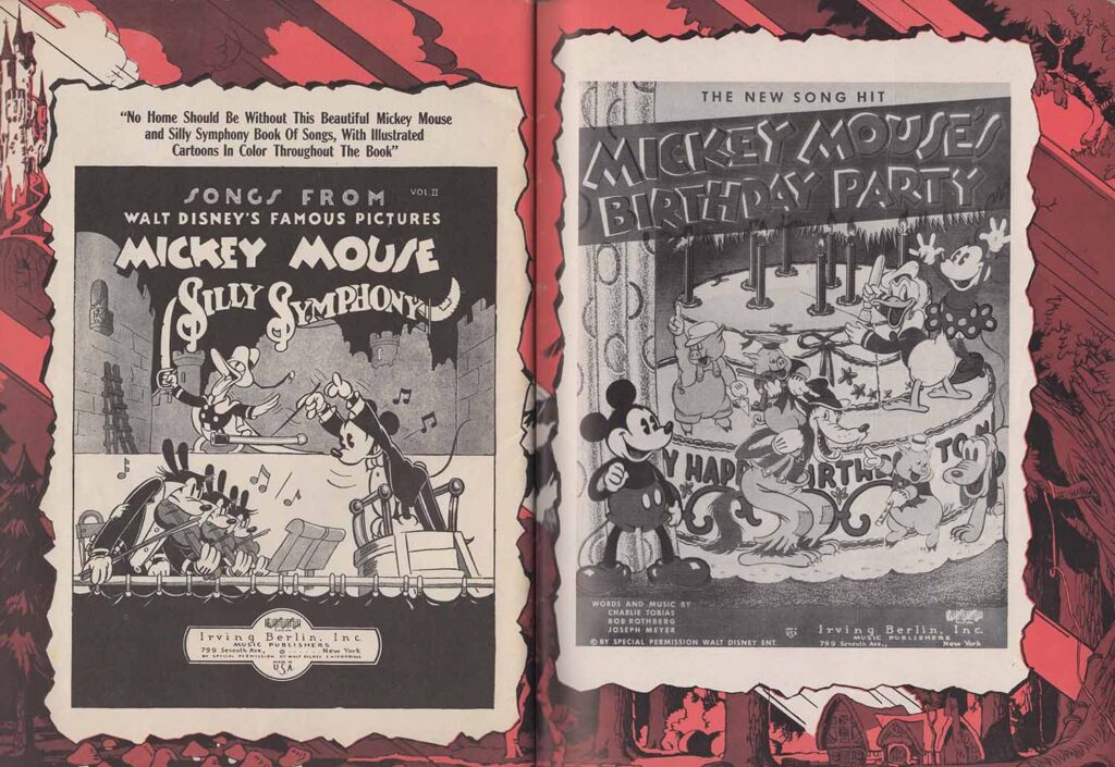 Just before the table of contents, we are offered a one-page summary of the film’s story. The last page and the back cover promote the scores for Silly Symphonies and Mickey’s Birthday.